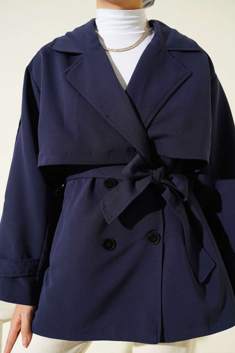Omuz Apoletli Kuşaklı Trençkot Lacivert