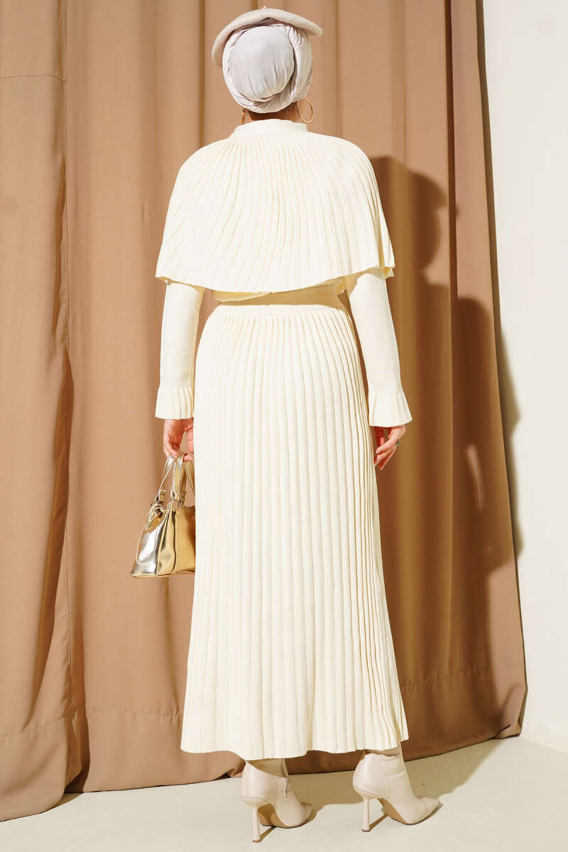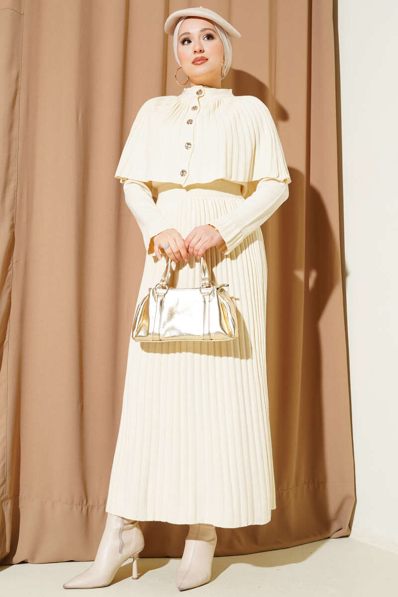 Pelerin Detaylı Pileli Triko Elbise Kahve