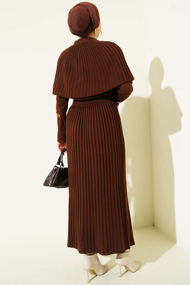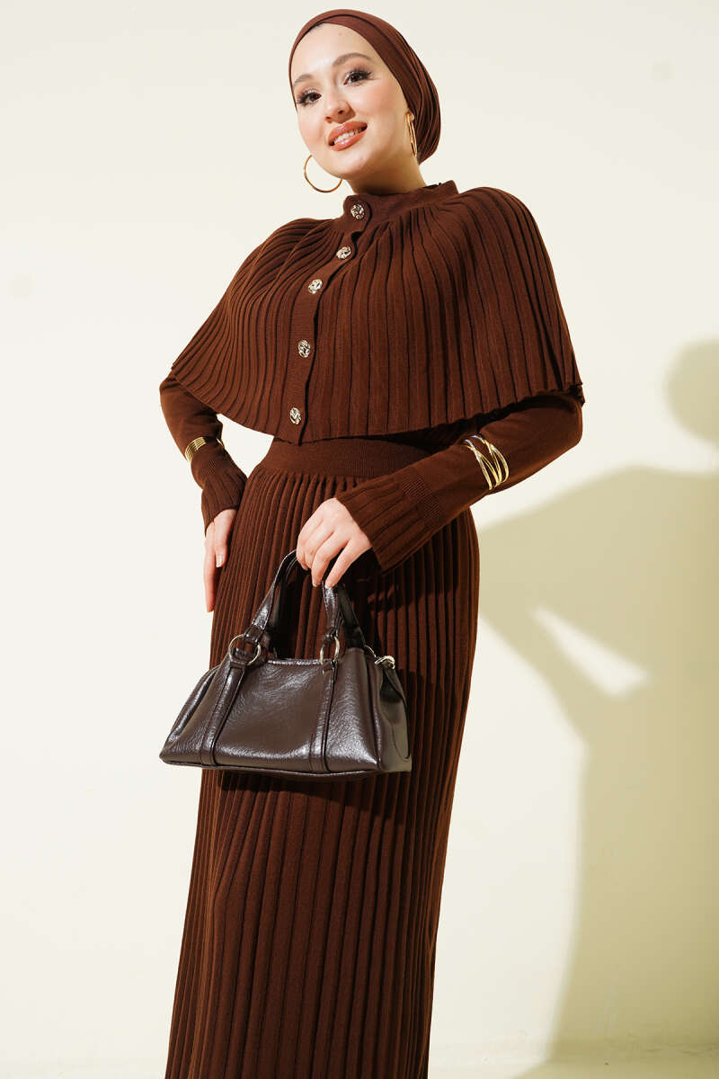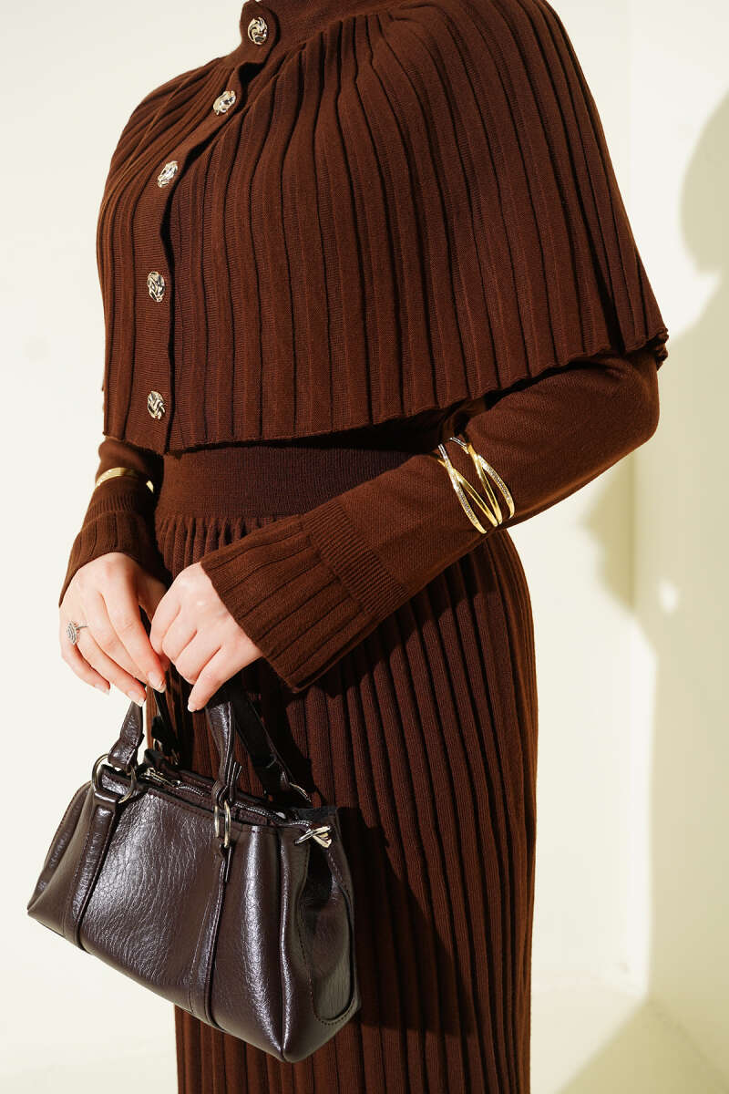Pelerin Detaylı Pileli Triko Elbise Kahve
