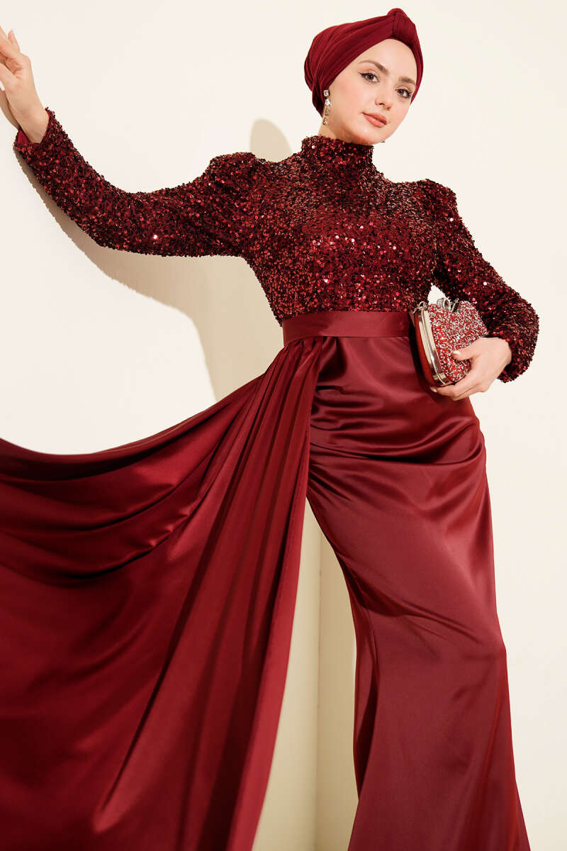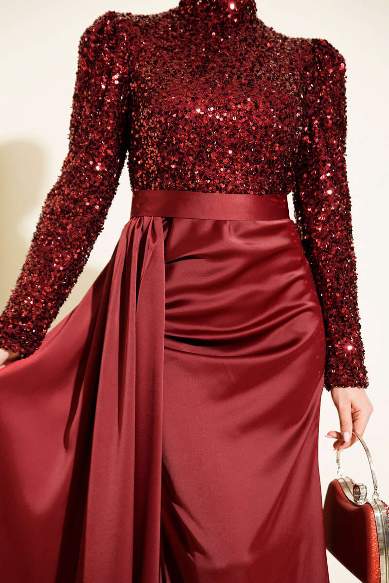 Pelerin Detaylı Pul Payet Abiye Elbise Bordo