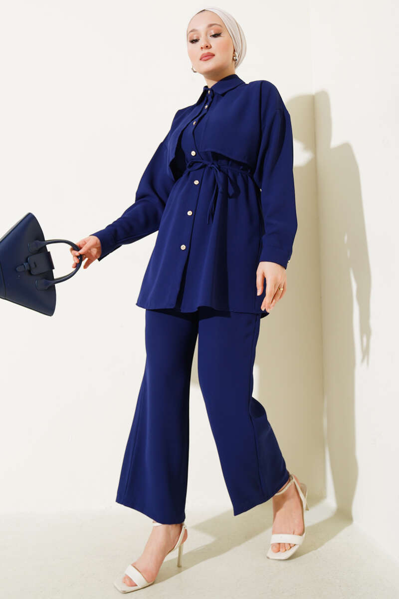 Pelerin Parçalı İp Kuşaklı İkili Takım Lacivert