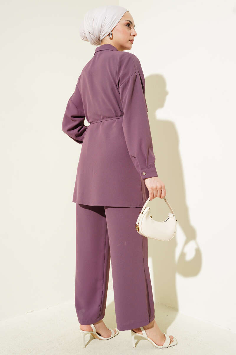 Pelerin Taşlı İp Kuşaklı İkili Takım Magenta
