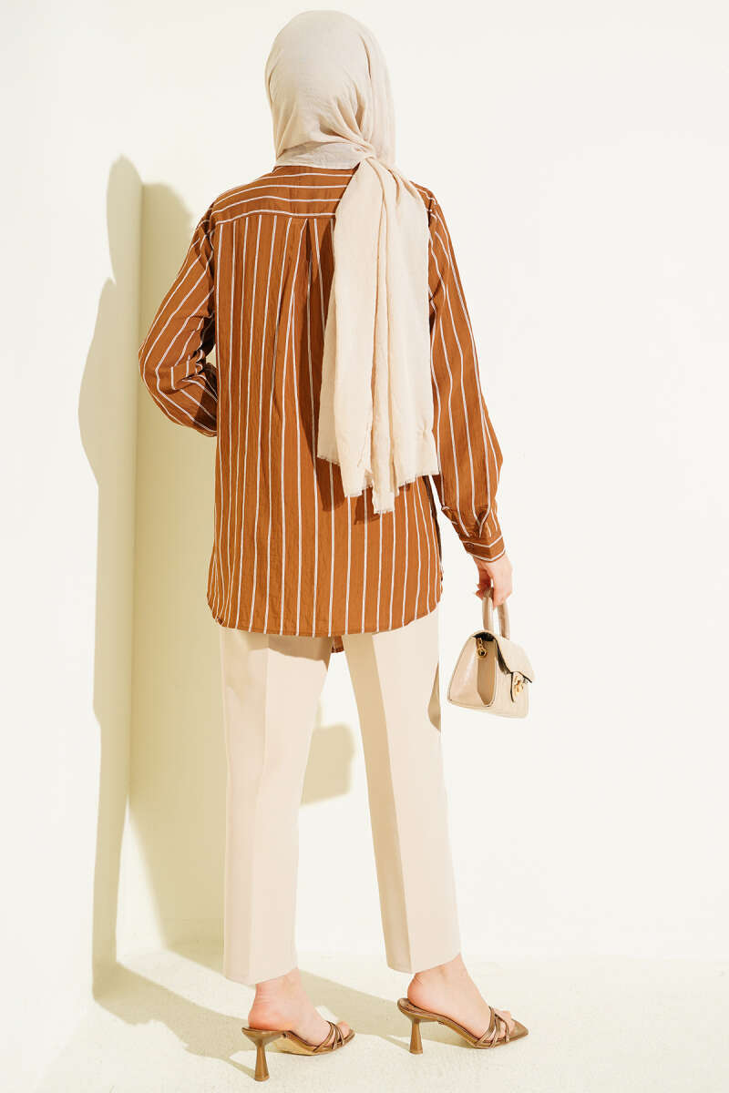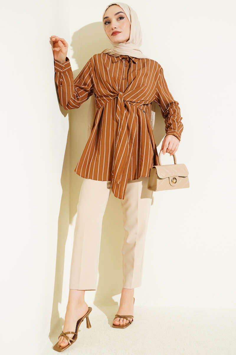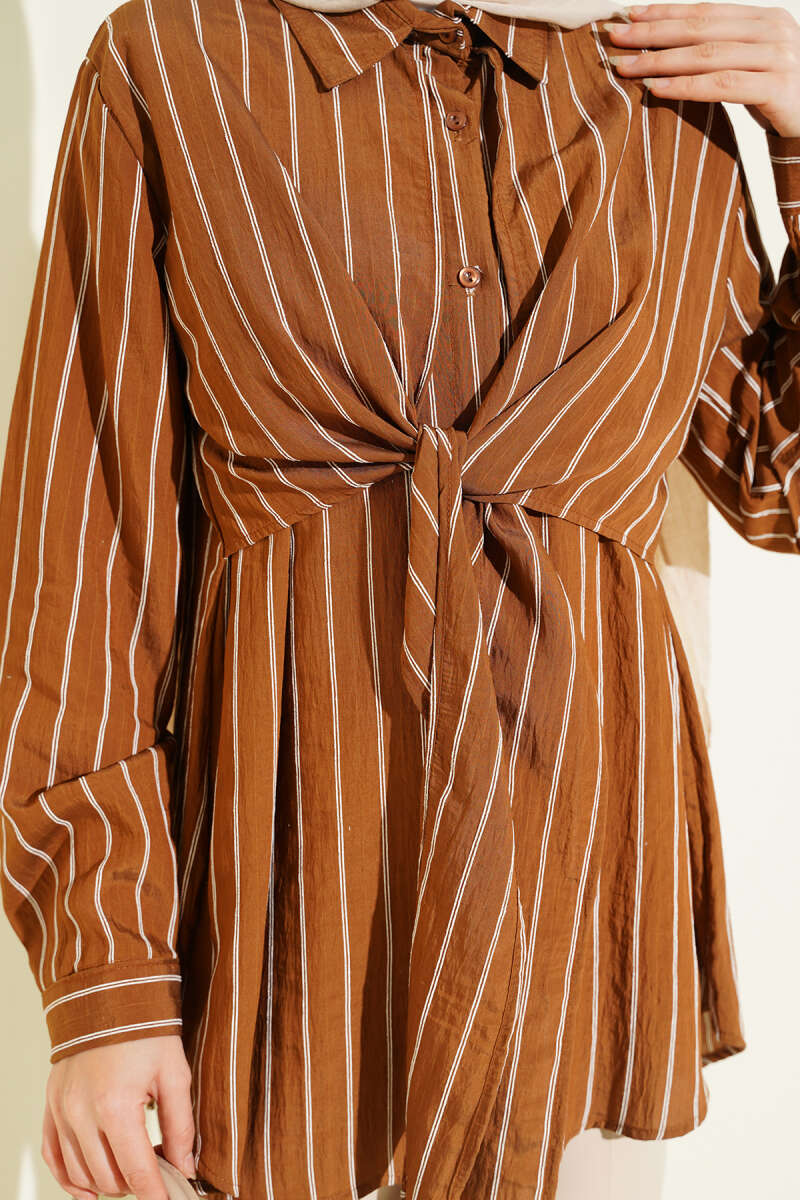 Dikey çizgili deseniyle zamansız bir şıklık sunan bu gömlek tunik, bel kısmındaki dinamik bağlama detayıyla modern bir form kazanıyor. Klasik gömlek yakası ve gizli düğme kapaması, tasarımın yalın ve profesyonel duruşunu desteklerken, hafif dökümlü kesimi gün boyu konfor sağlıyor.