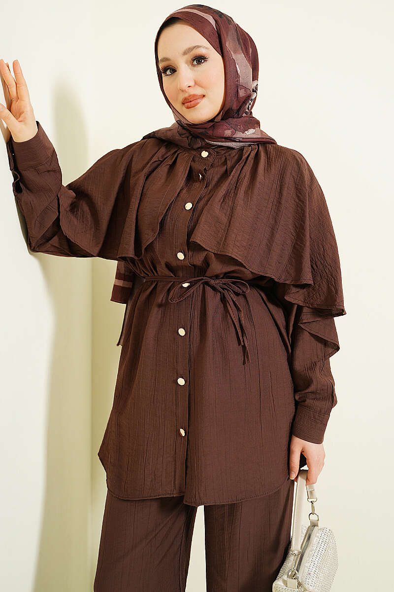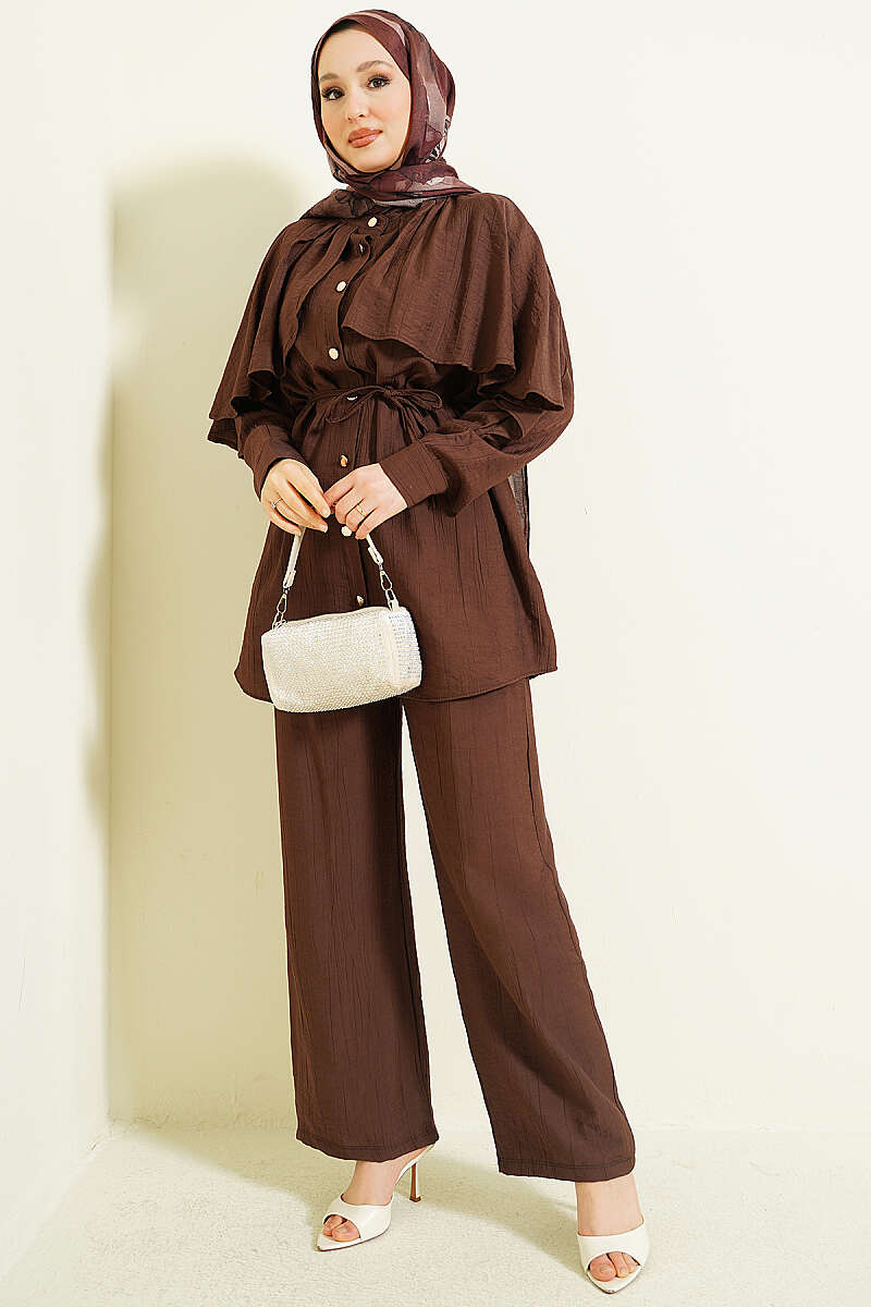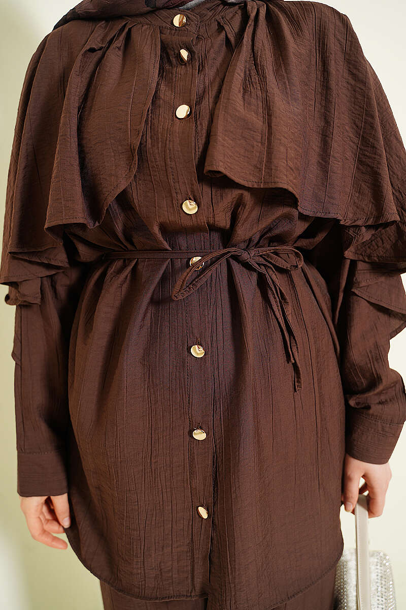 Pelerinli Gold Düğmeli Takım Kahve
