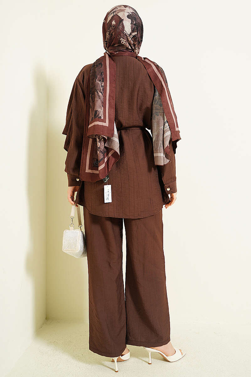 Gold Düğmeli Poliviskon Etekli Takım Kahve
