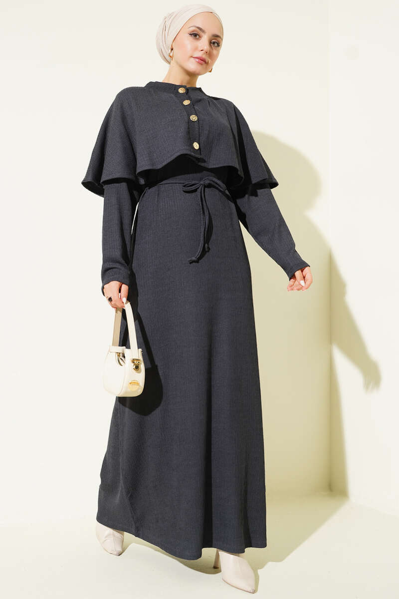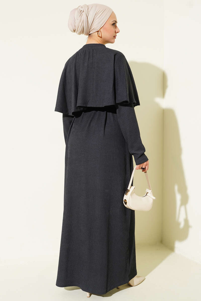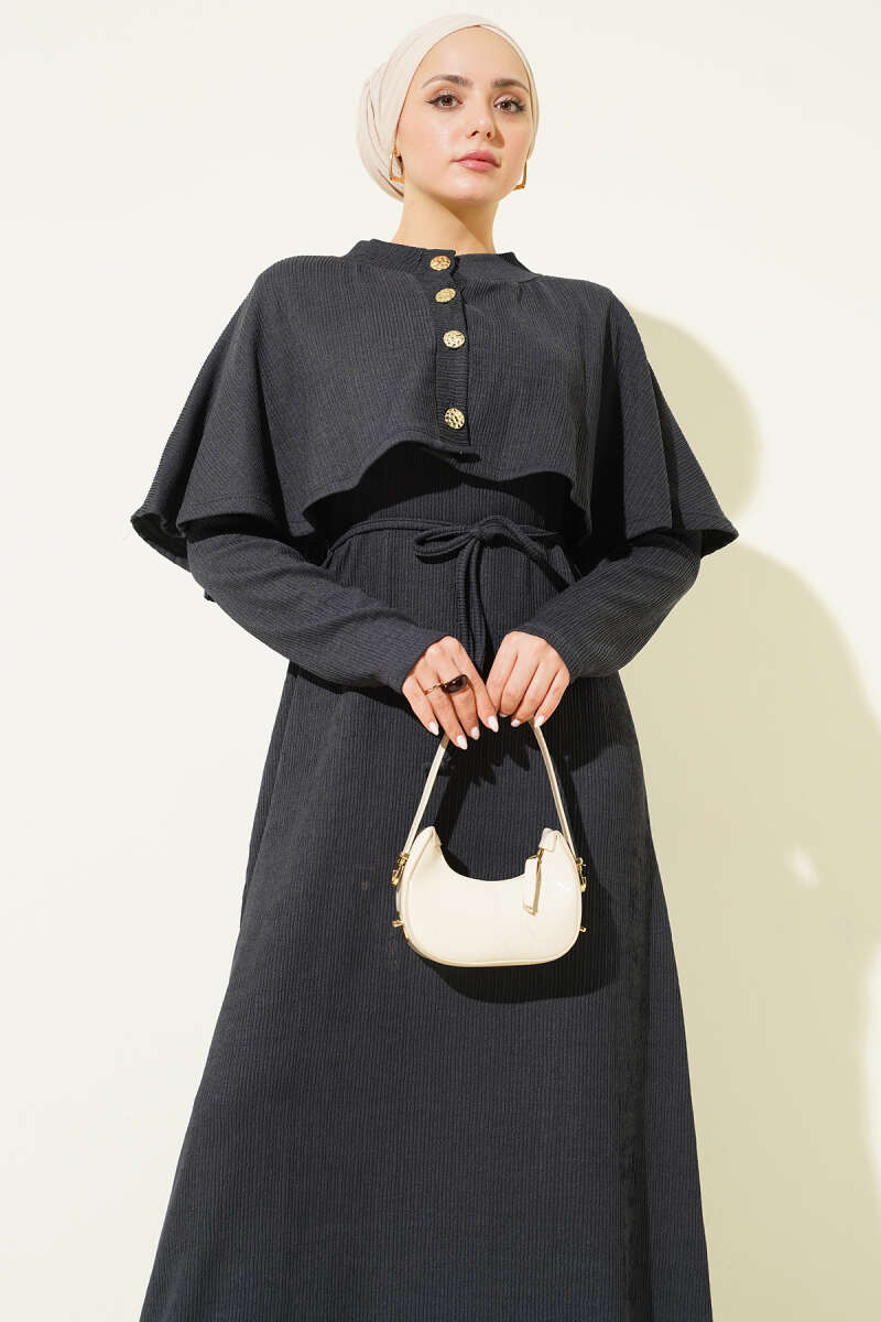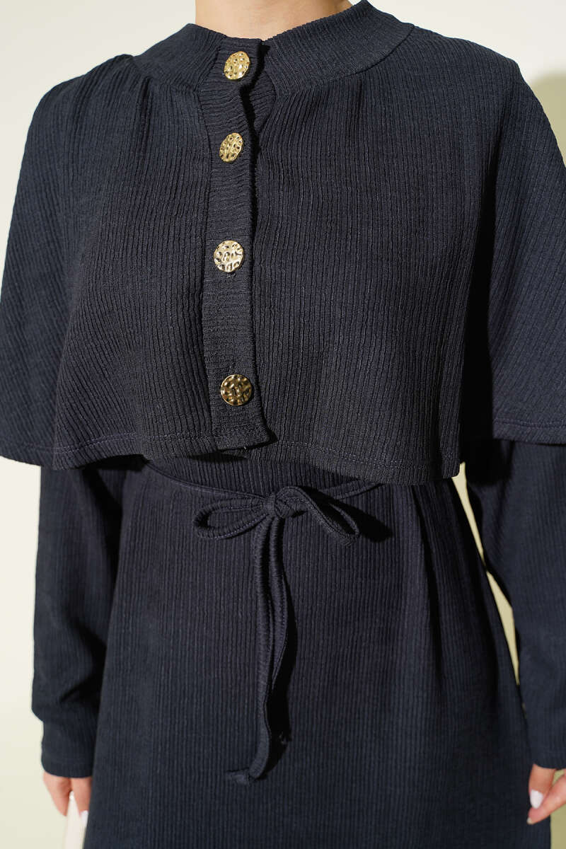 Pelerinli İp Bağcıklı Elbise Lacivert