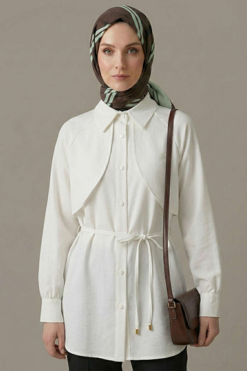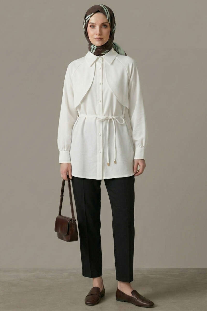 Pelerinli İp Detaylı Tunik Beyaz