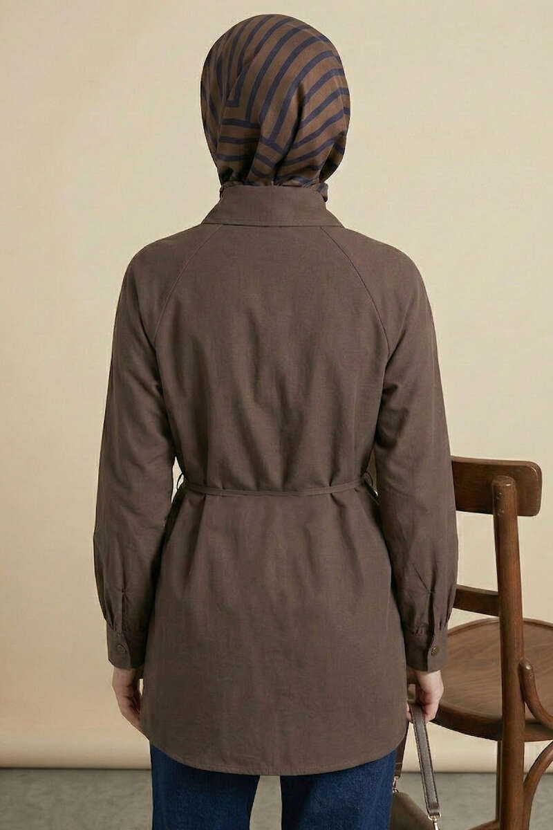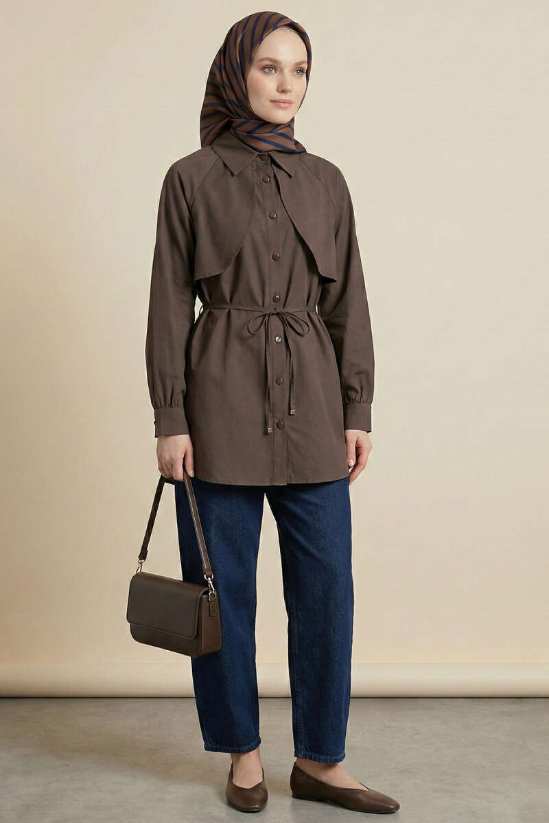Pelerinli İp Detaylı Tunik Kahve