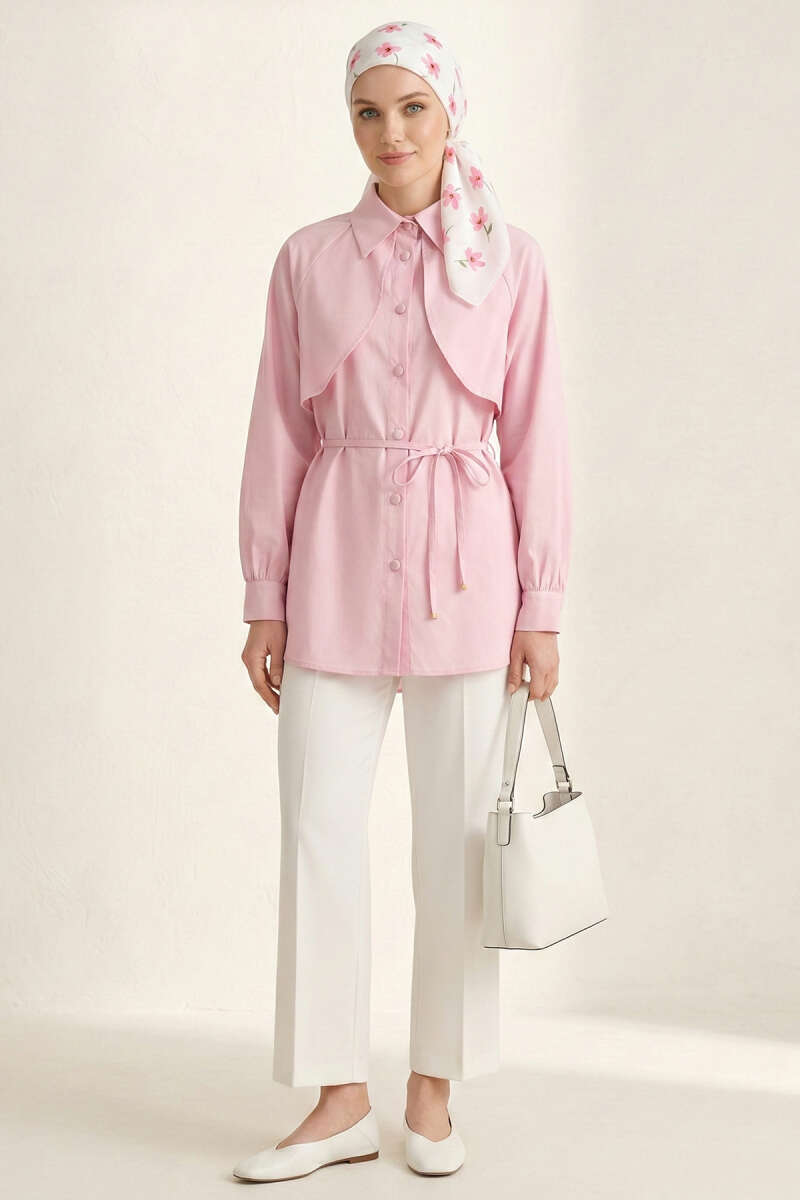 Pelerinli İp Detaylı Tunik Pembe