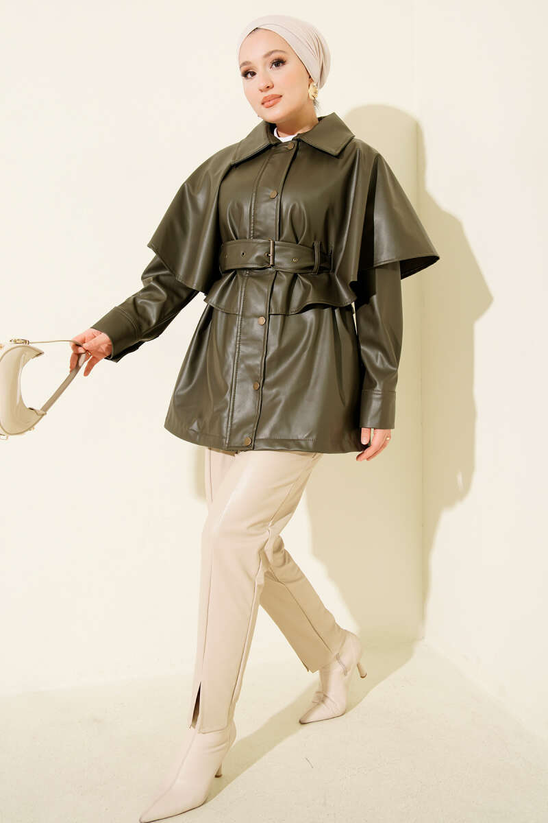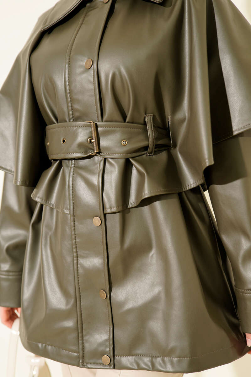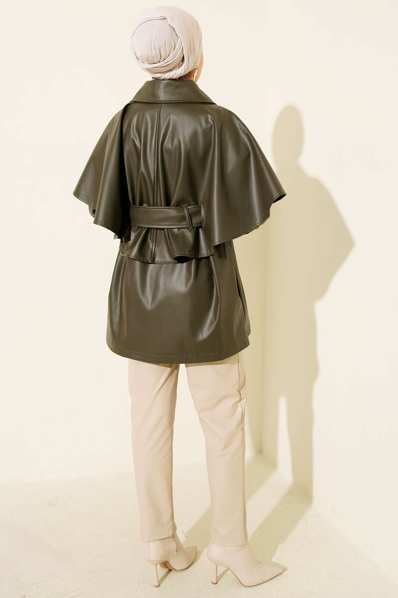 Pelerinli Kemerli Deri Ceket Haki