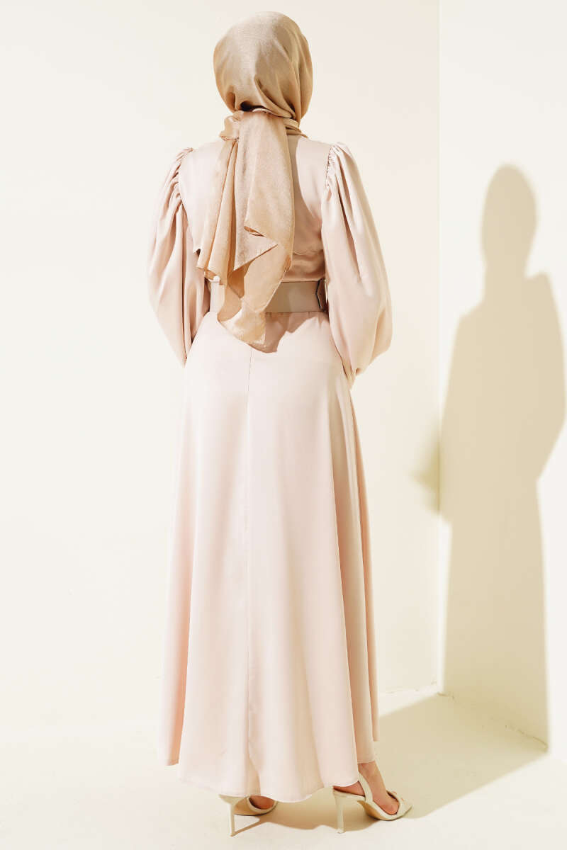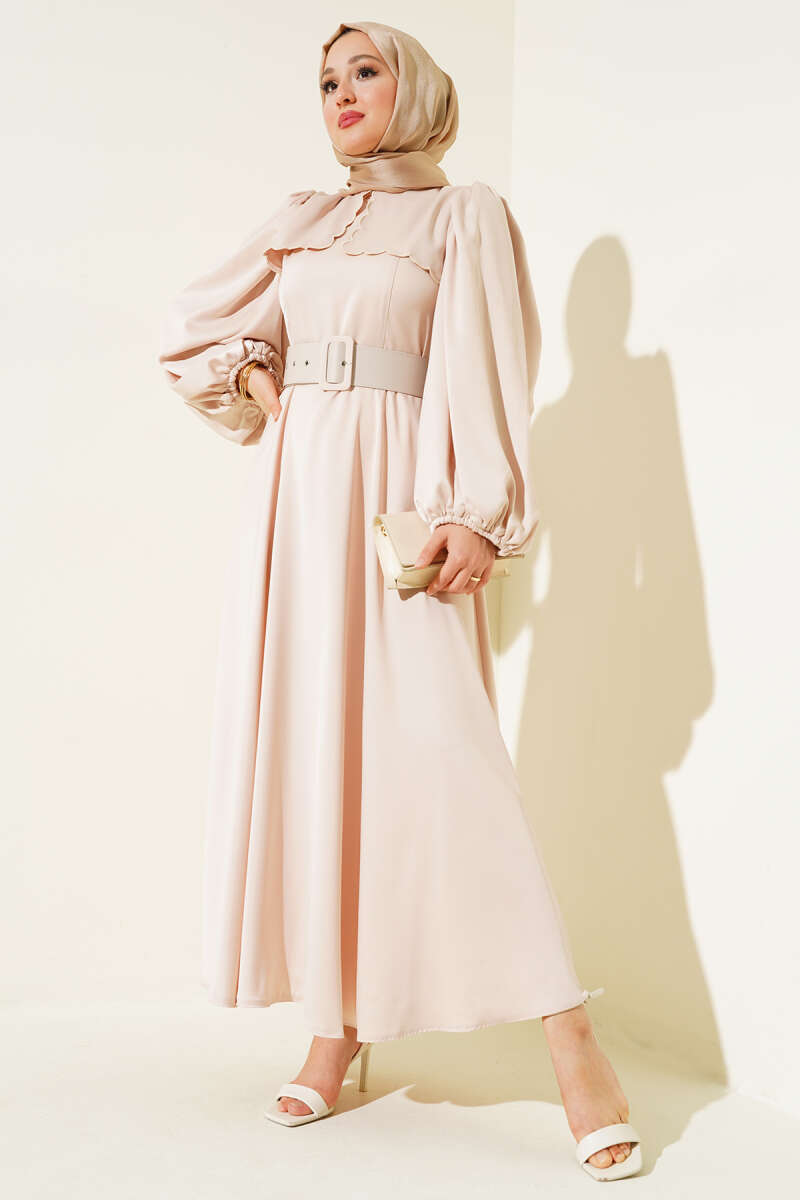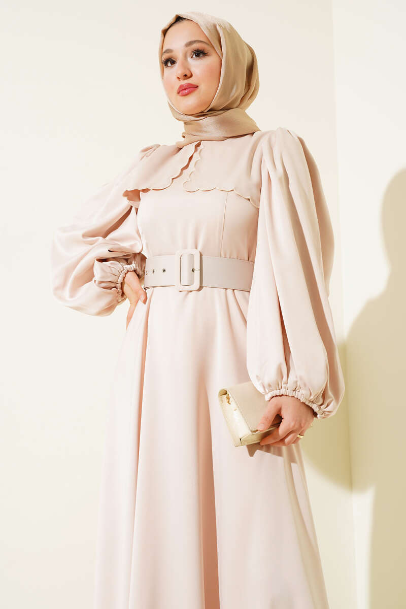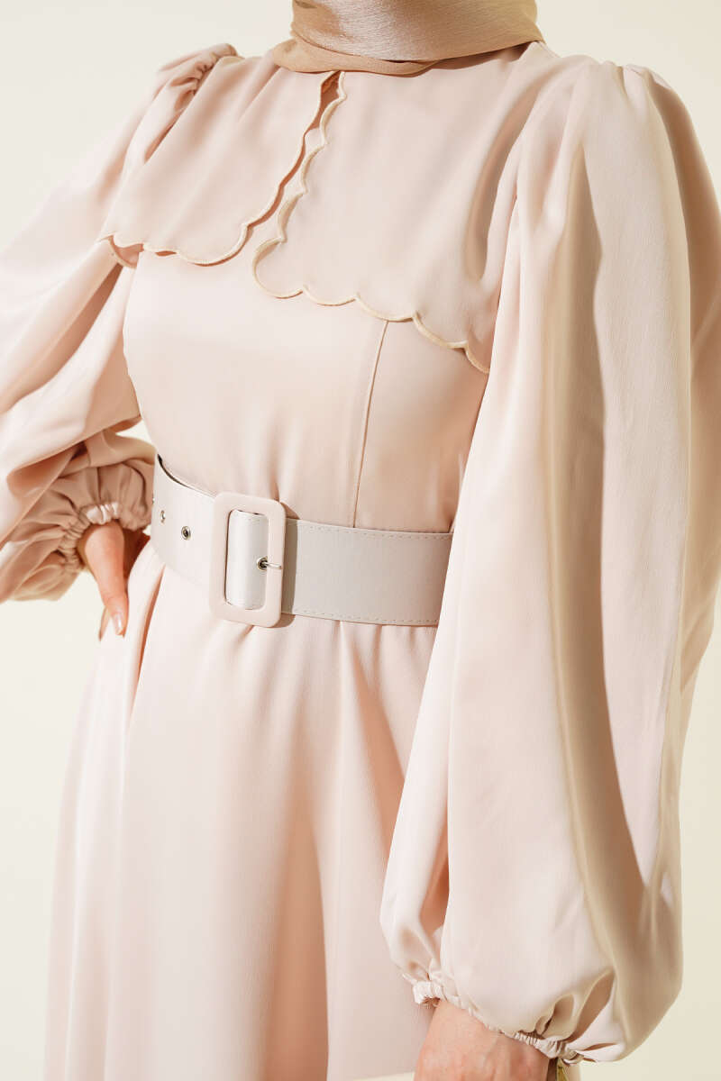Düğmeli Yandan Bağlamalı Bisiklet Yaka Elbise Bej