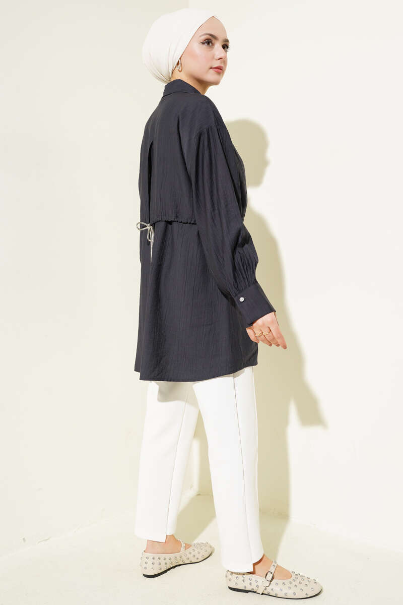 Gizli Düğmeli Bel Kuşaklı Gömlek Siyah