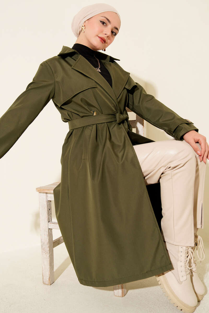 Kuşaklı Düğmeli Kruvaze Yaka Trençkot Siyah
