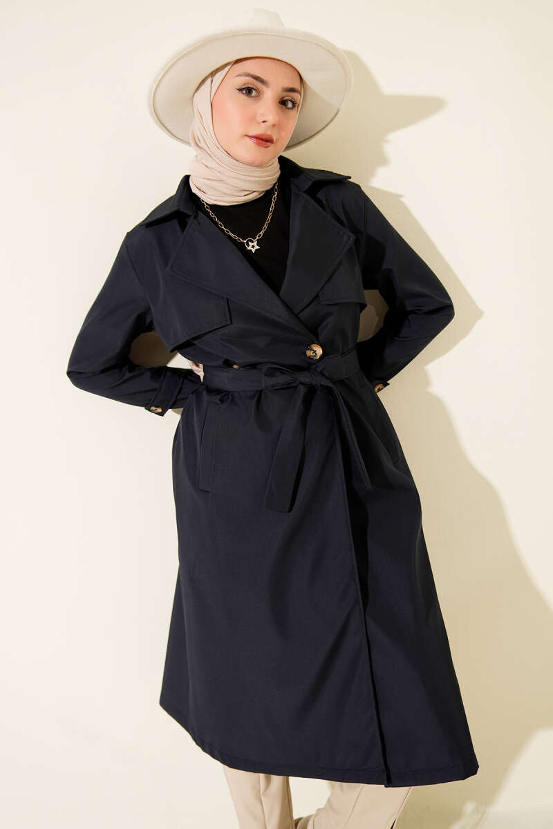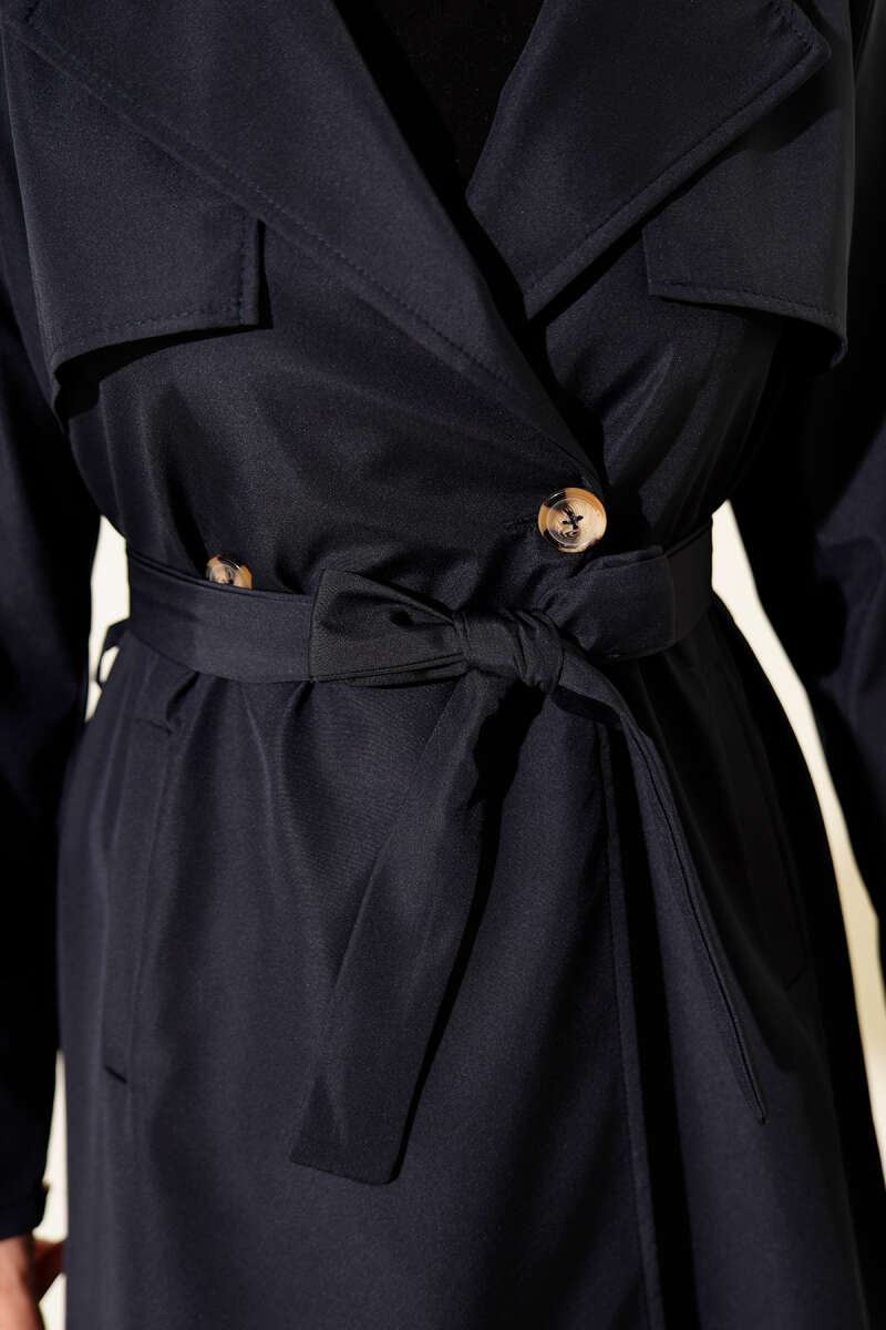 Kuşaklı Düğmeli Kruvaze Yaka Trençkot Siyah