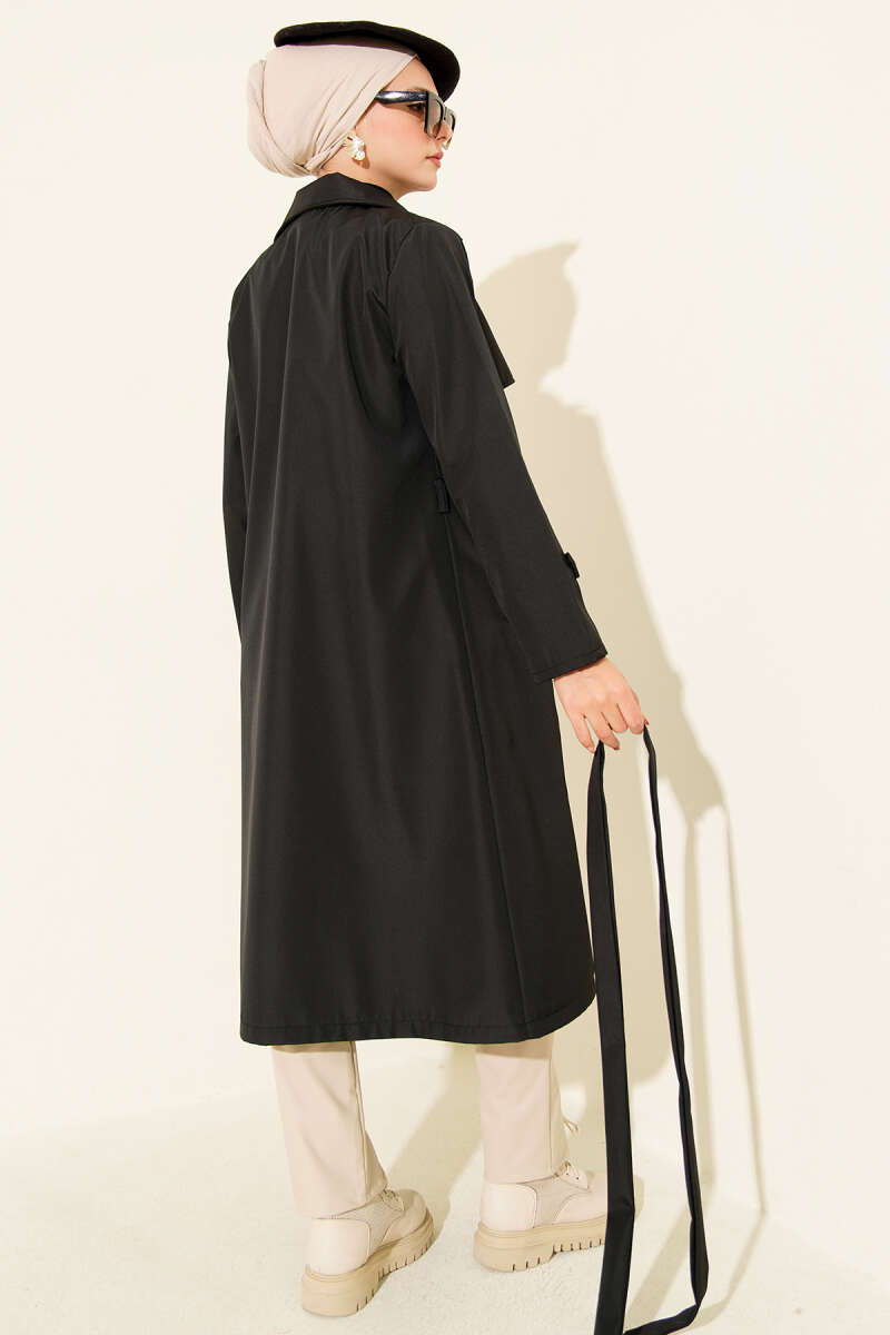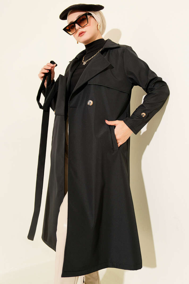Kuşaklı Düğmeli Kruvaze Yaka Trençkot Siyah