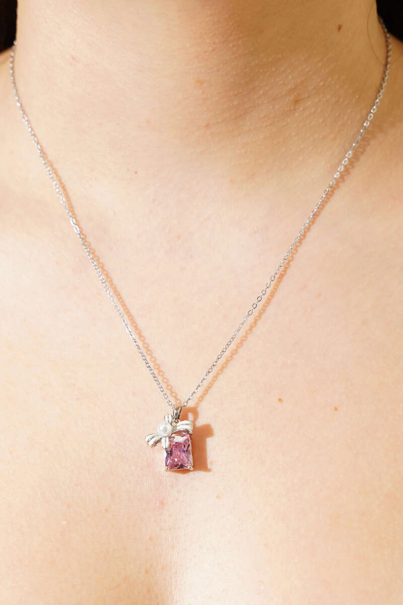Pembe Taşlı İnci Fiyonklu Kolye Gümüş