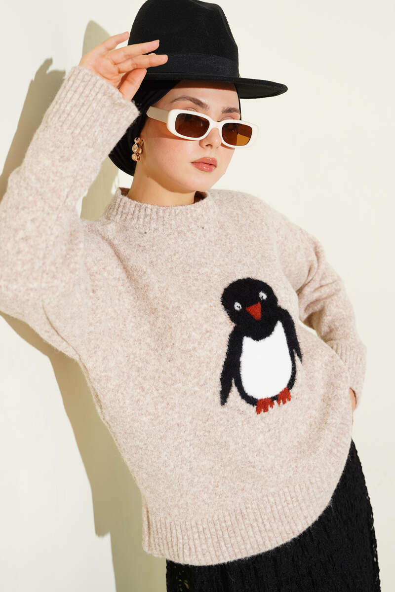 Penguen Baskılı Yumoş Triko Kazak Bej