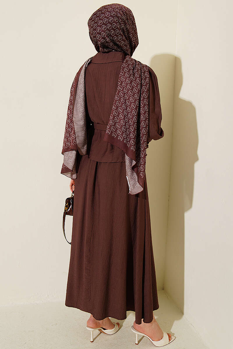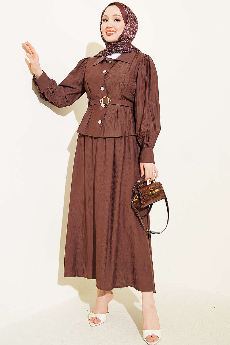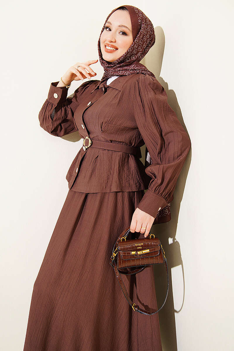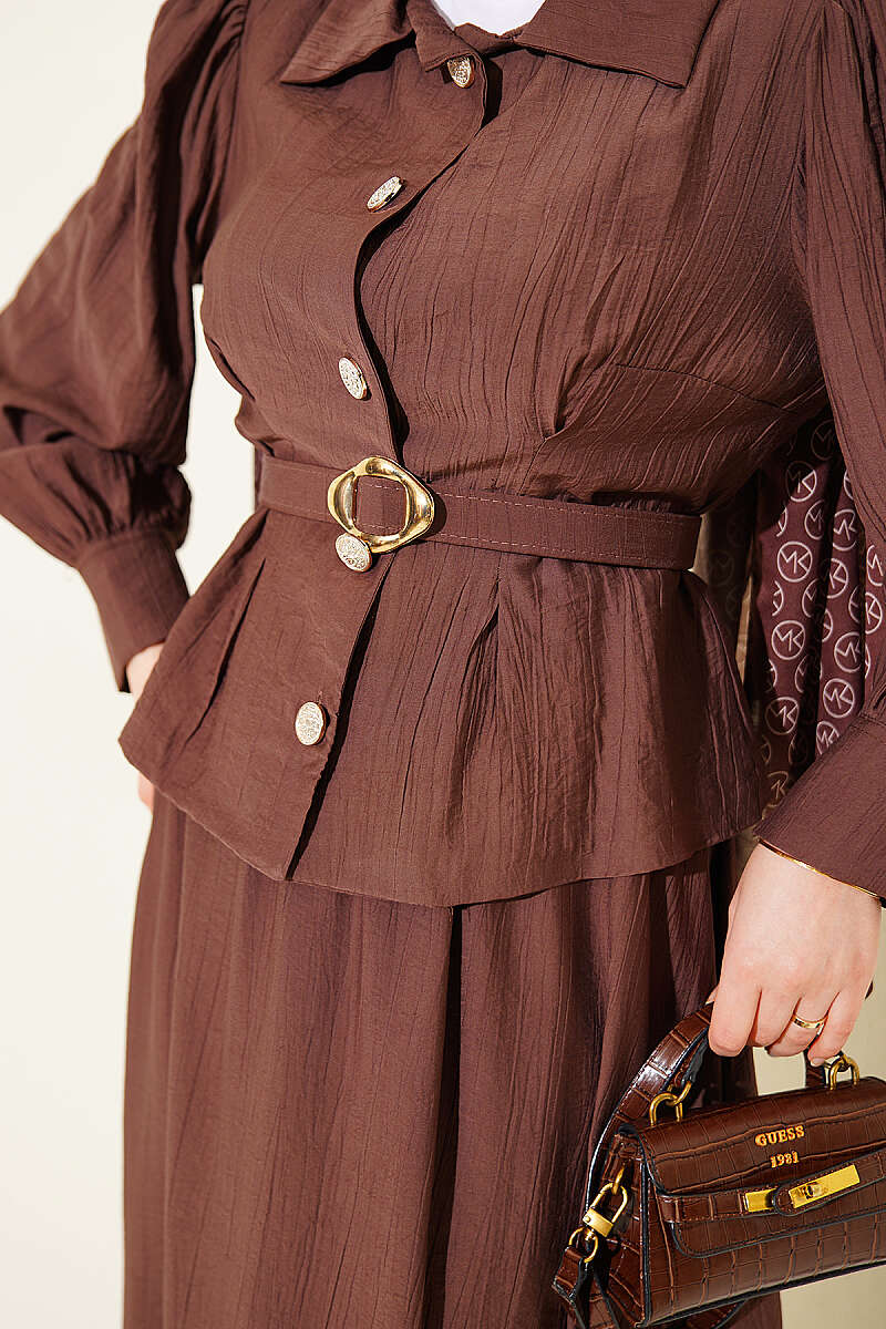 Pens Detaylı Kemerli Etekli Takım Kahve