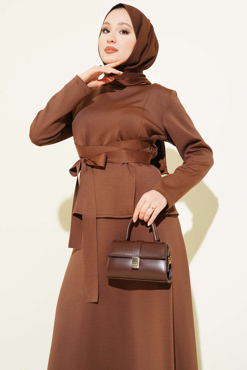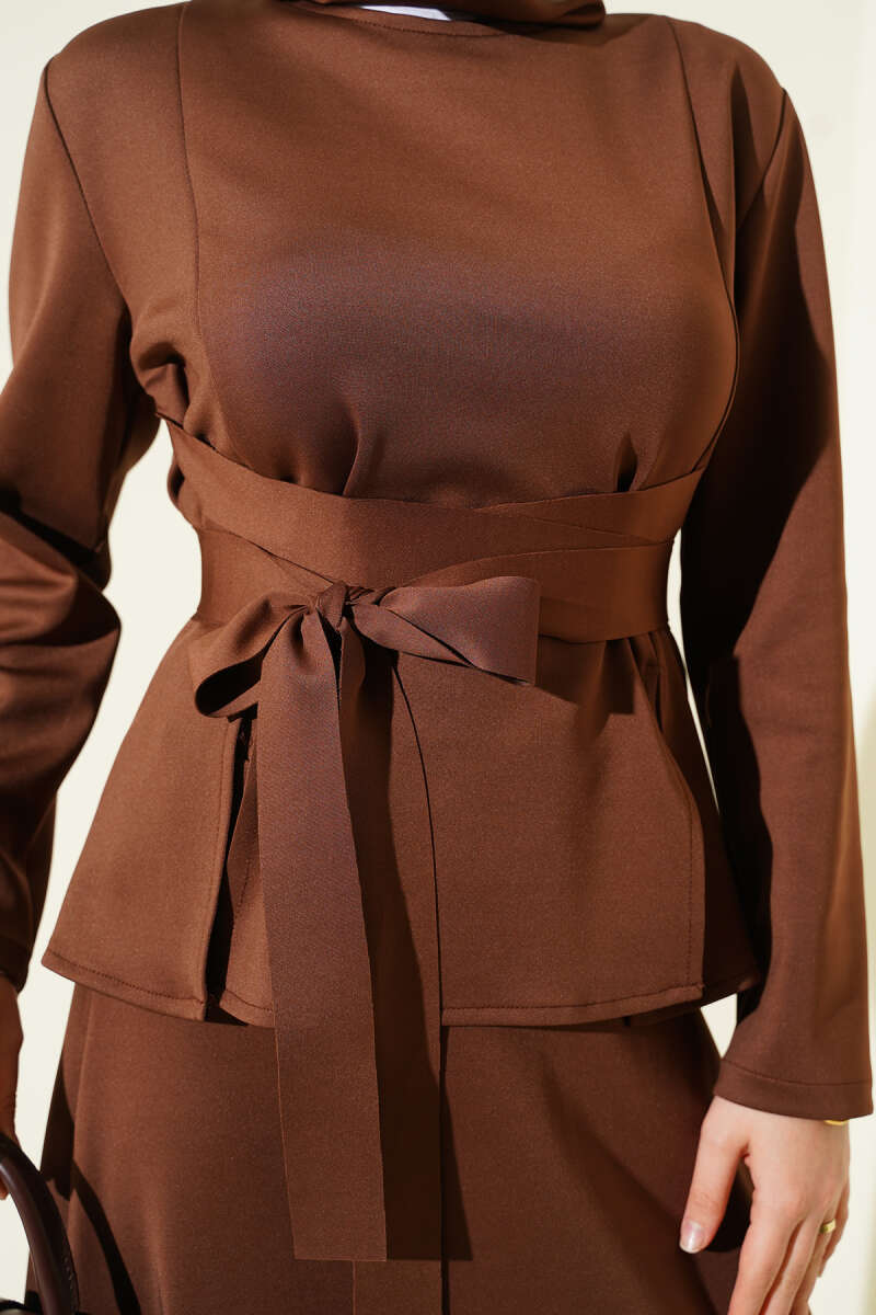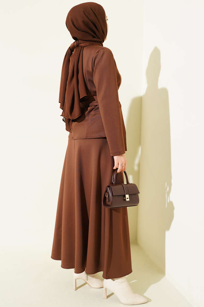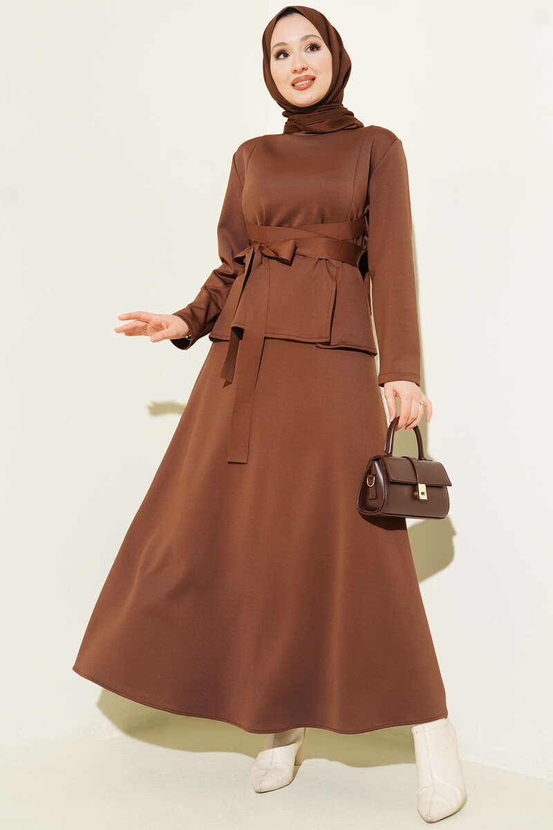 Pens Detaylı Kuşaklı Scuba İkili Etekli Takım Bej
