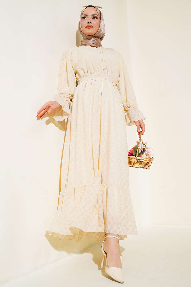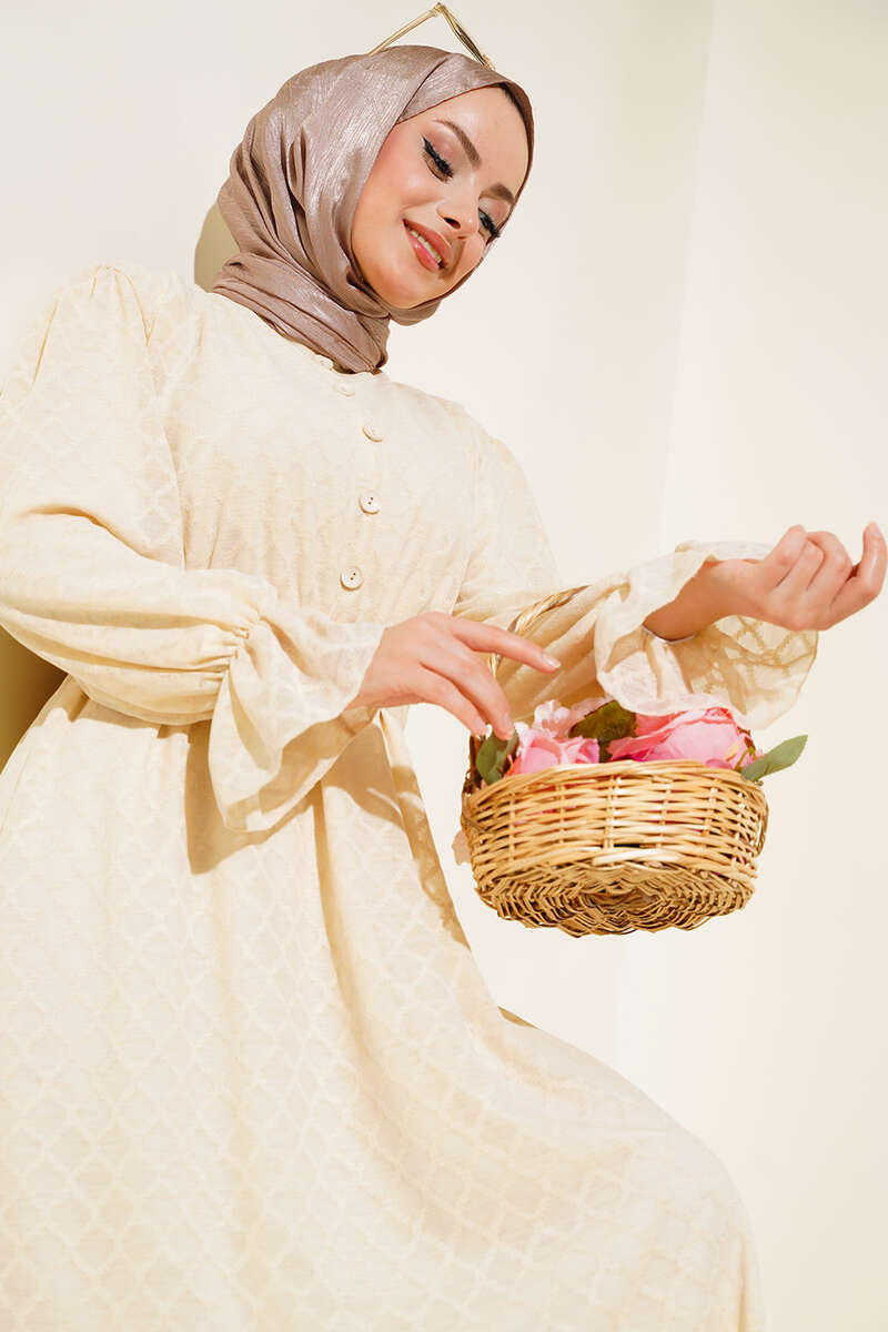 Düğmeli Brode Bilek Lastikli Elbise Bej