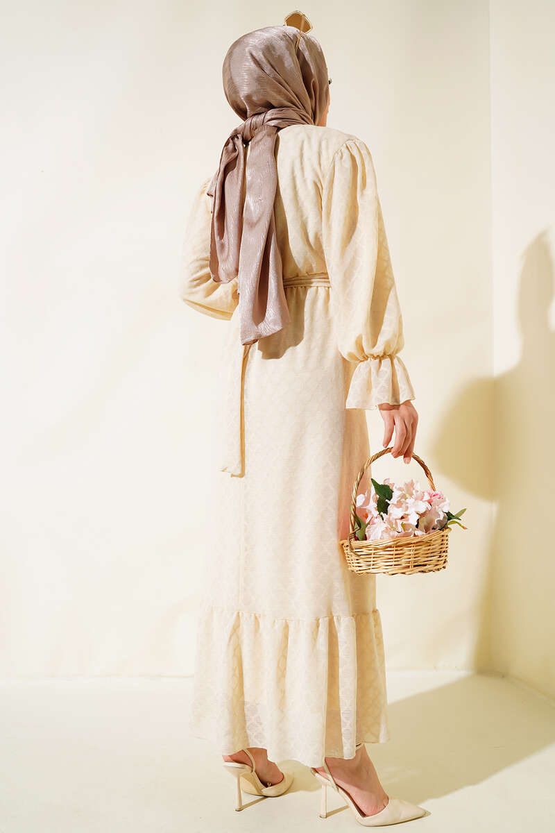 Gizli Düğmeli Kuşaklı Elbise Bej