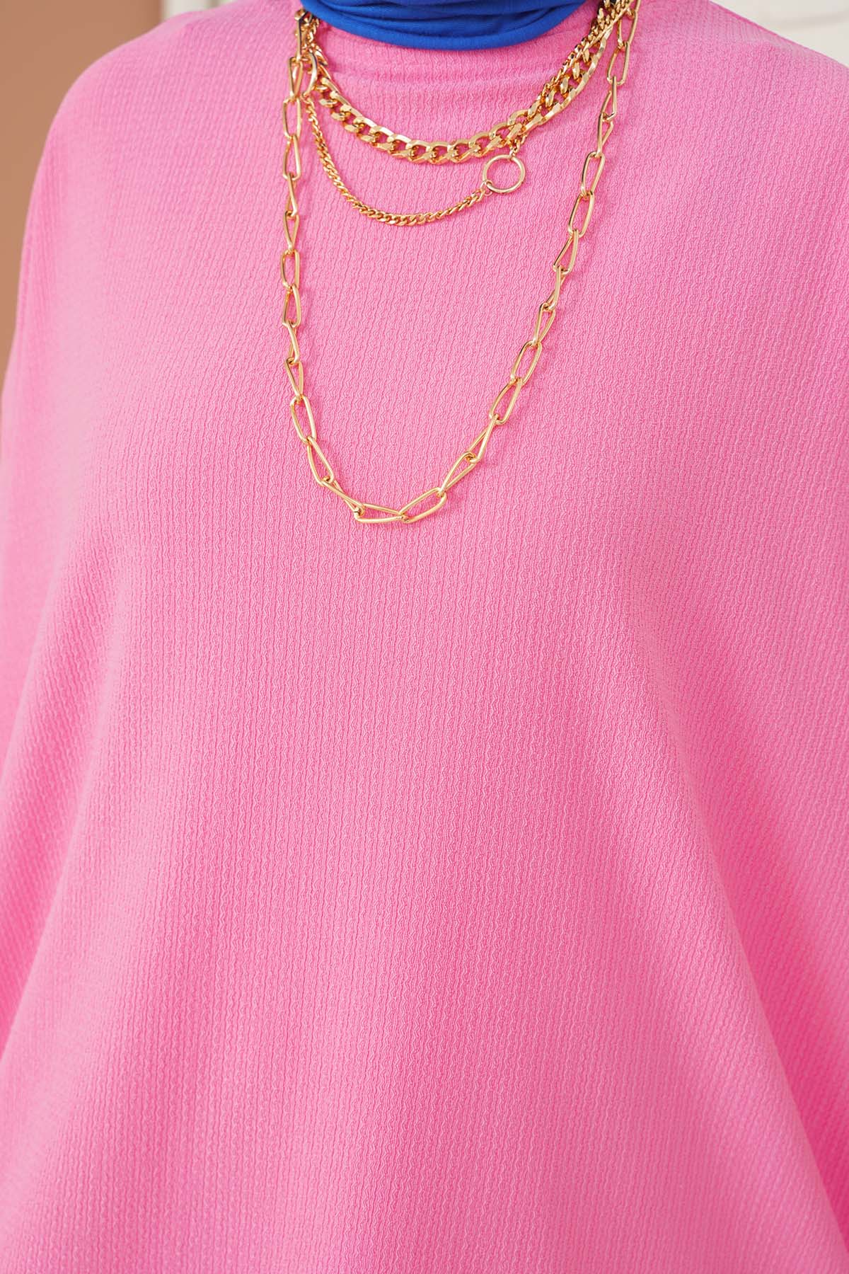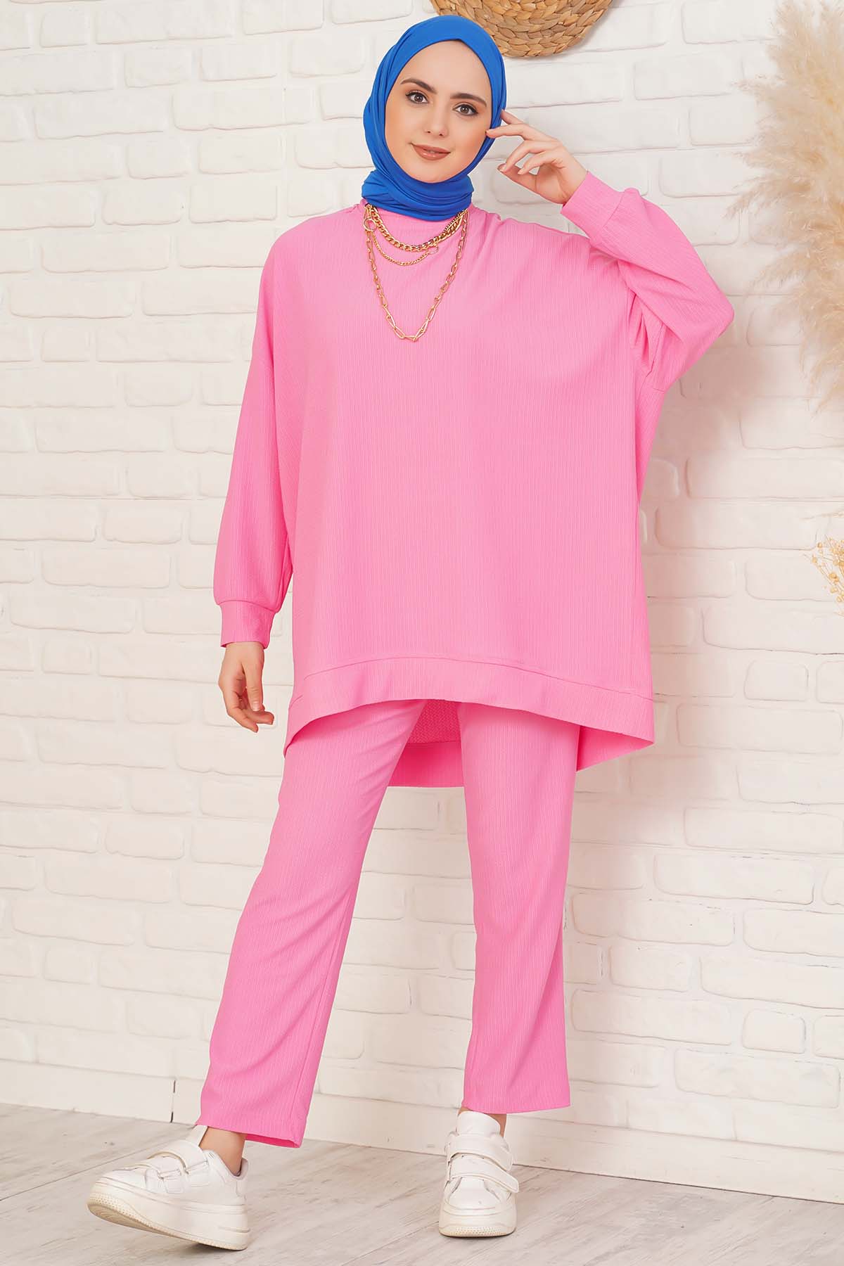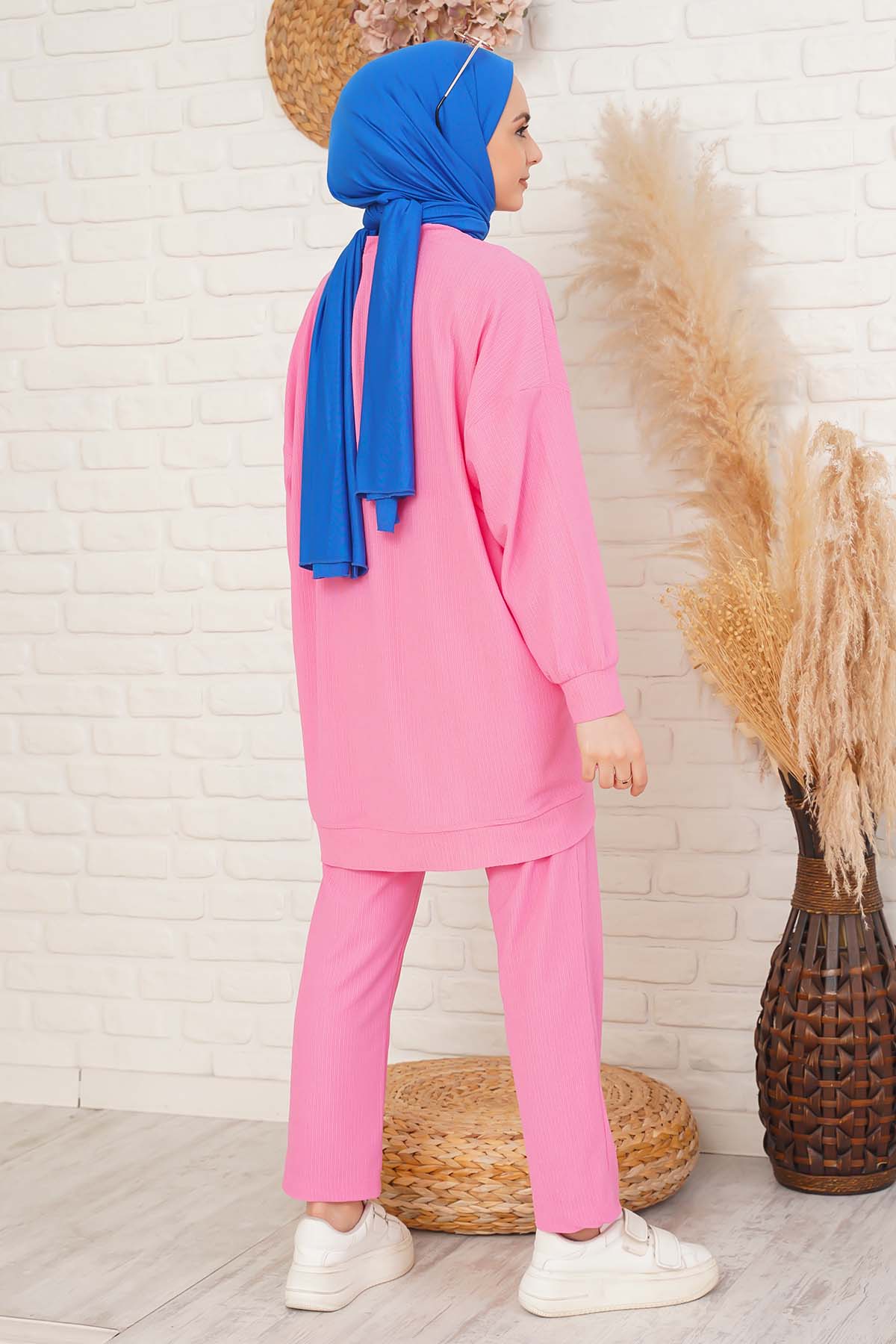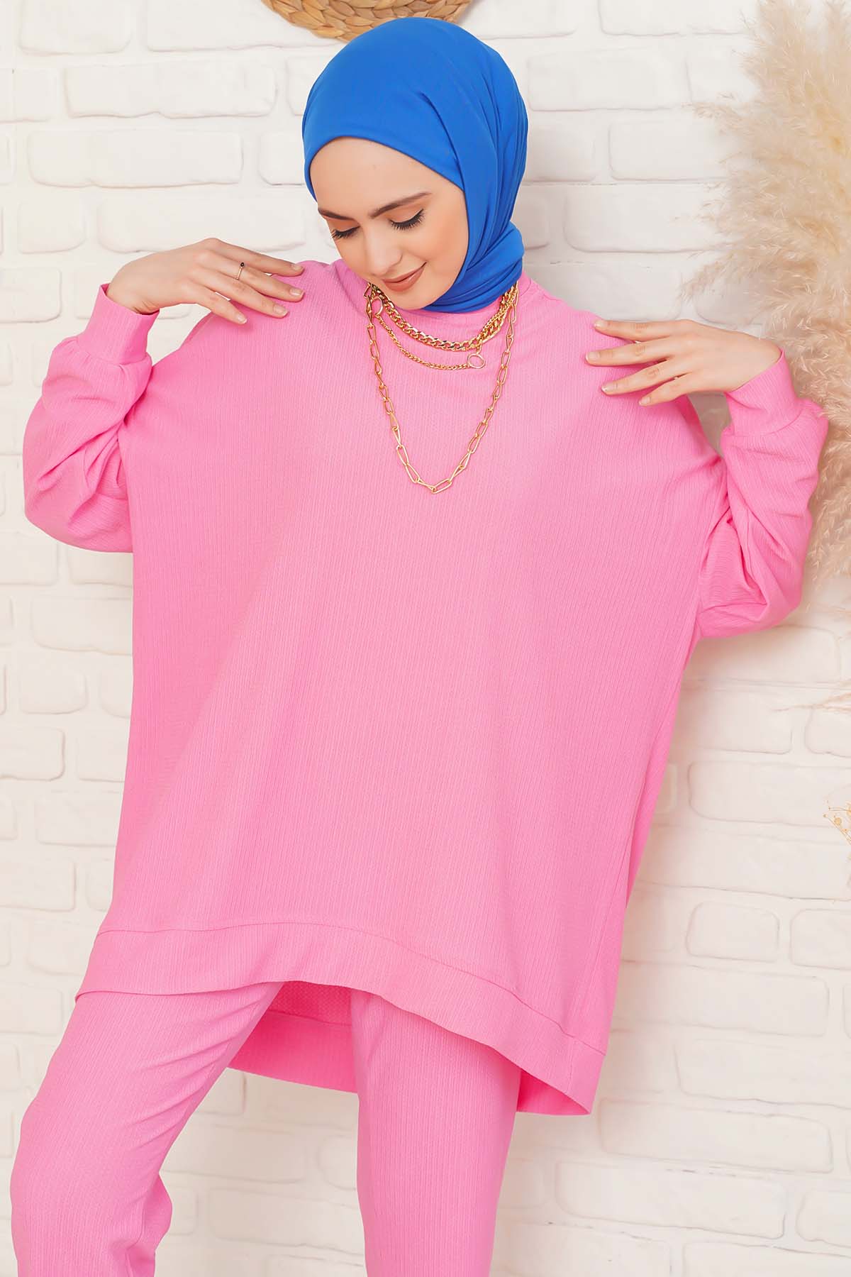 Kadın giyimde kurtarıcı parçaların başında gelen takımlar sizinle. Bisiklet yakalı olan tuniğimizin kol uçları esnektir. Tunik düşük omuzludur. Pantolonumuzun beli lastiklidir cepsizdir.