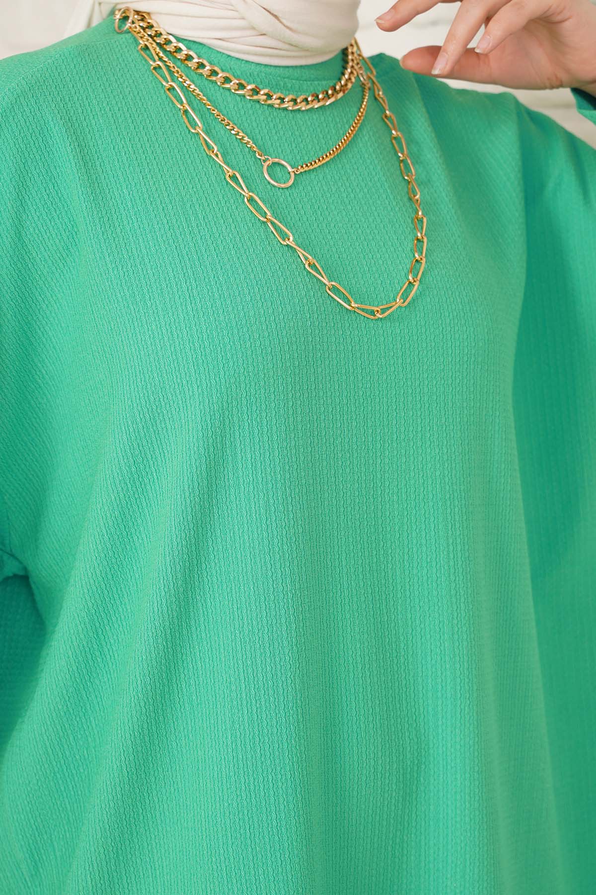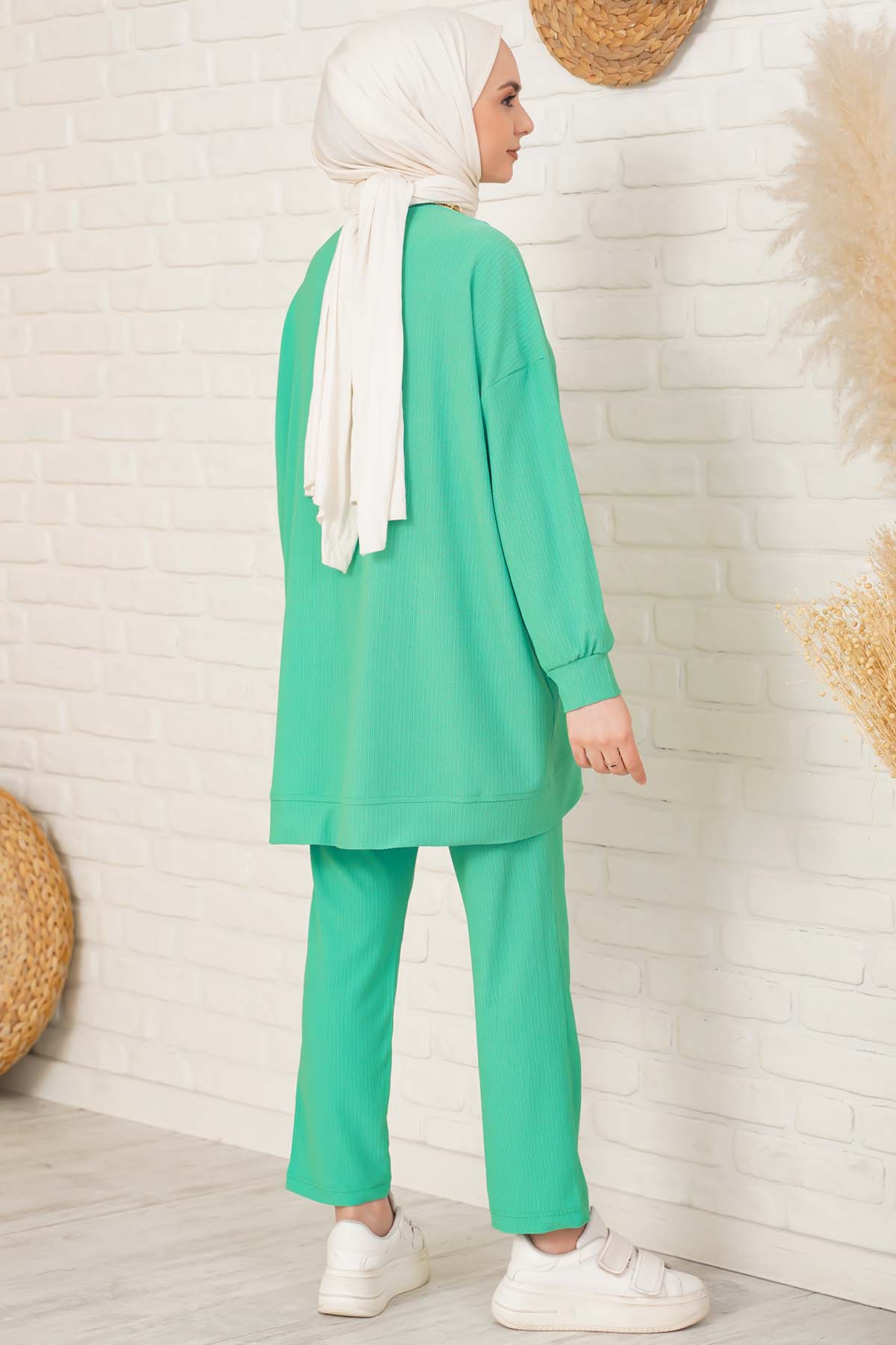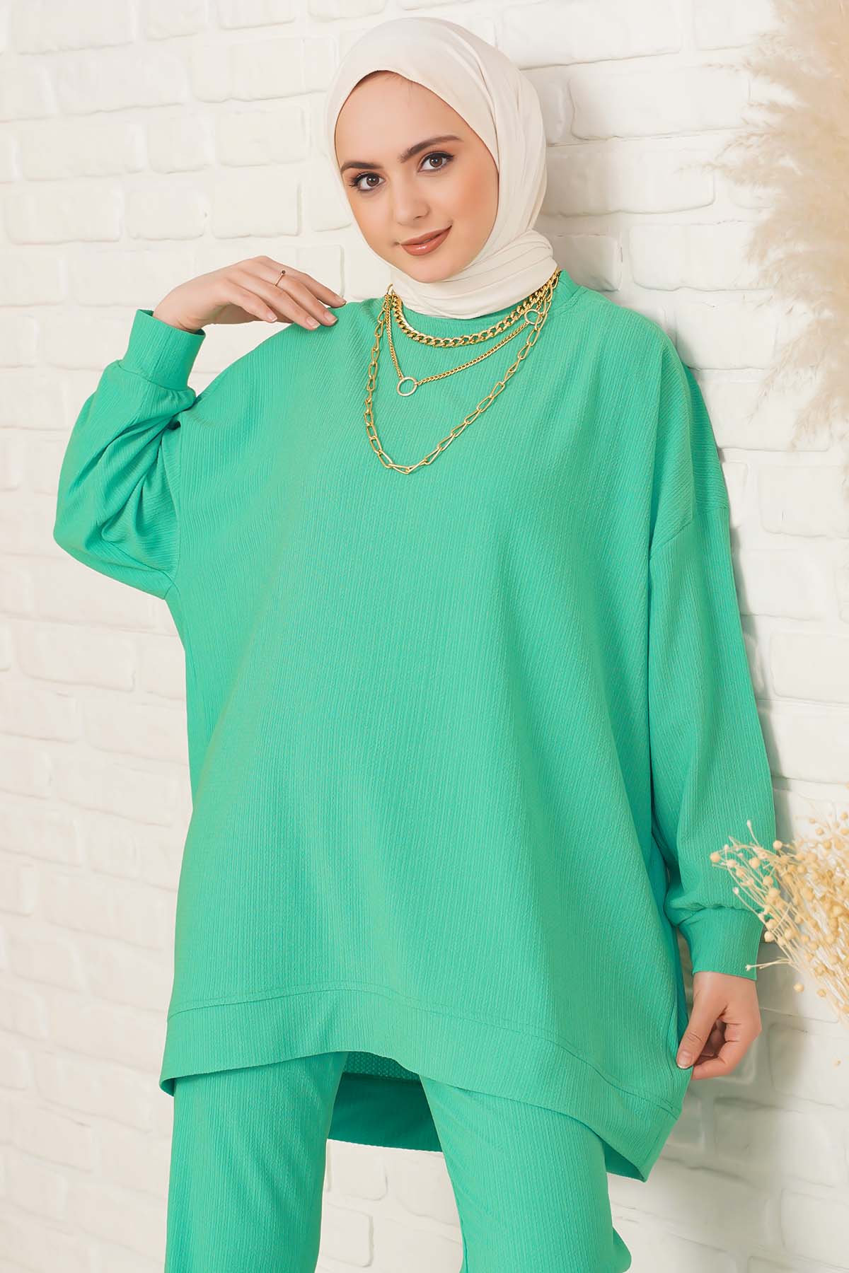 Kadın giyimde kurtarıcı parçaların başında gelen takımlar sizinle. Bisiklet yakalı olan tuniğimizin kol uçları esnektir. Tunik düşük omuzludur. Pantolonumuzun beli lastiklidir cepsizdir.