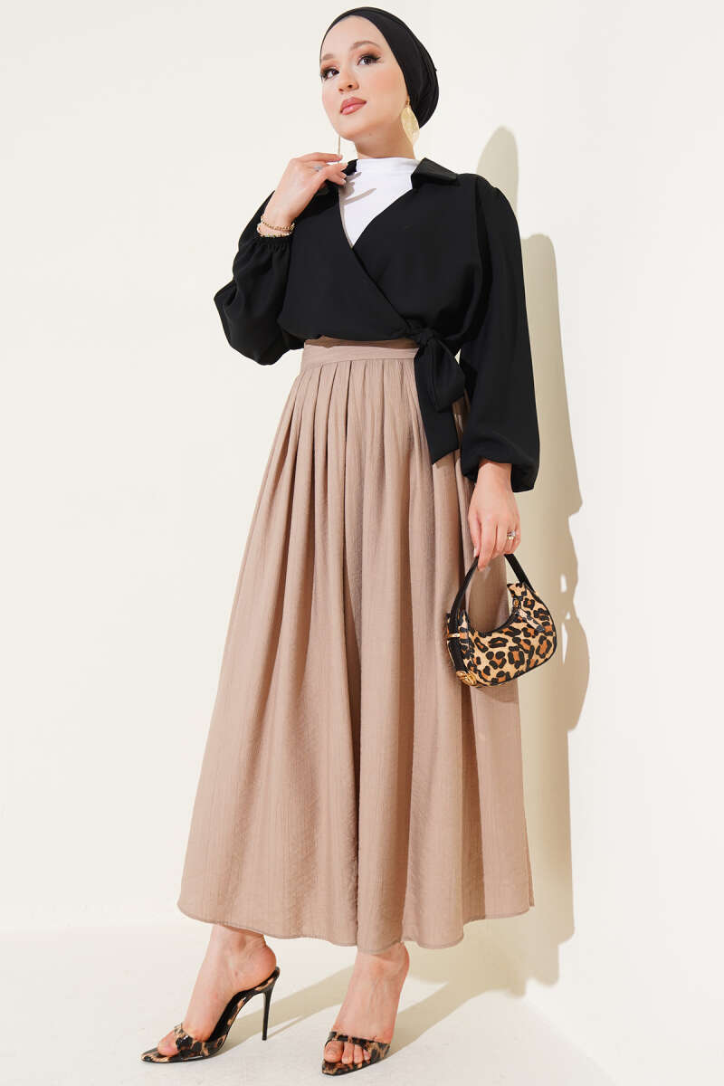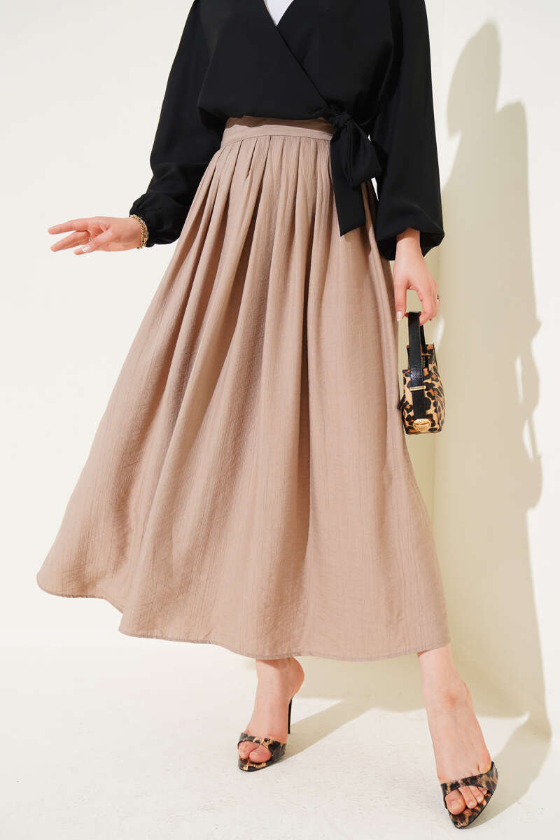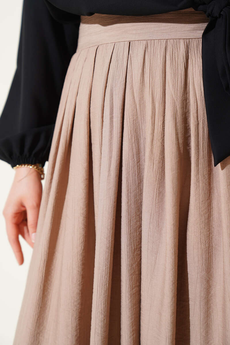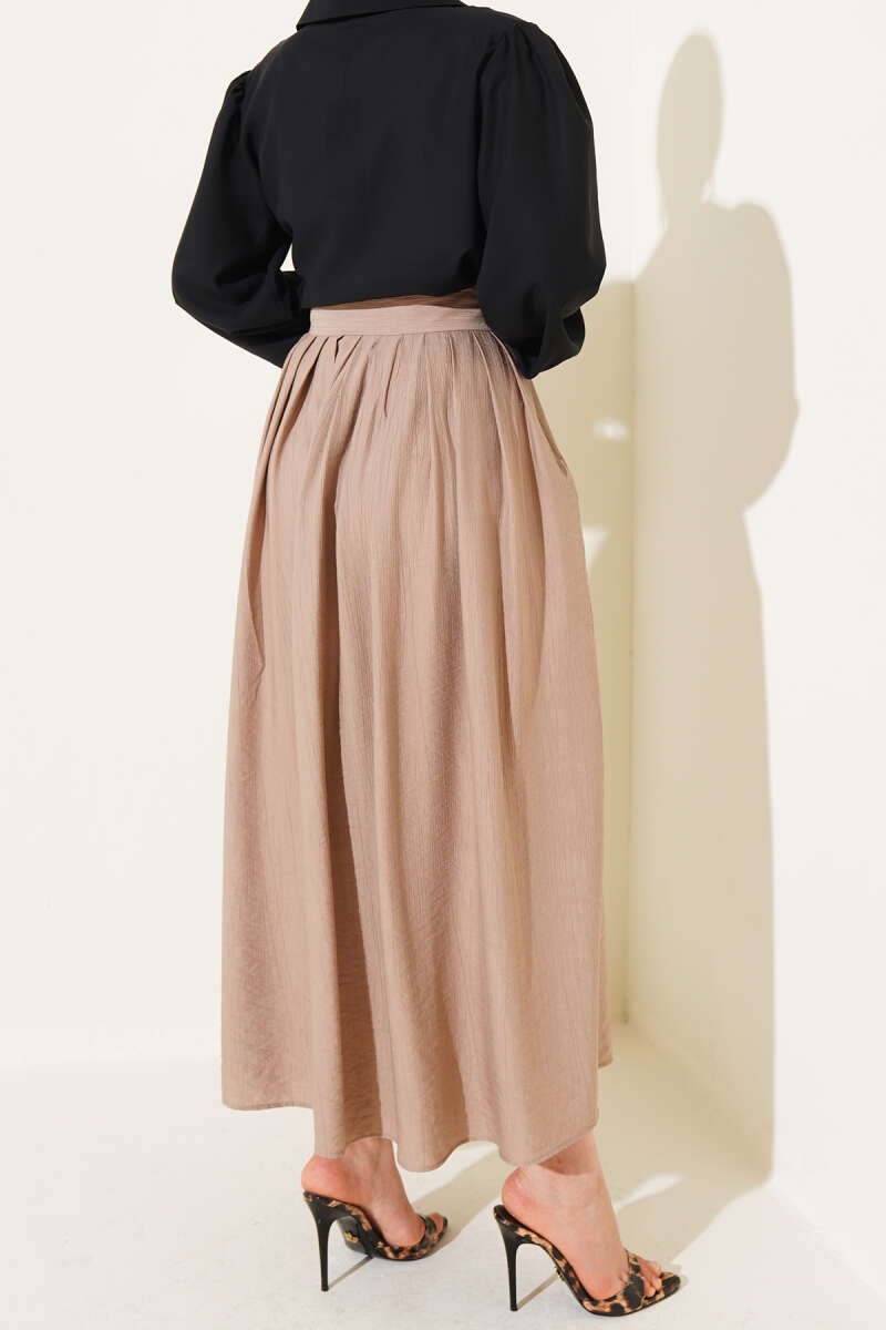 Beli Kemerli Lastikli Pileli Etek Vizon