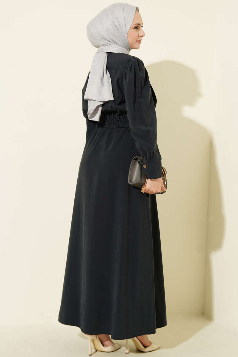 Bel Lastikli Yaka Fırfırlı Elbise Siyah