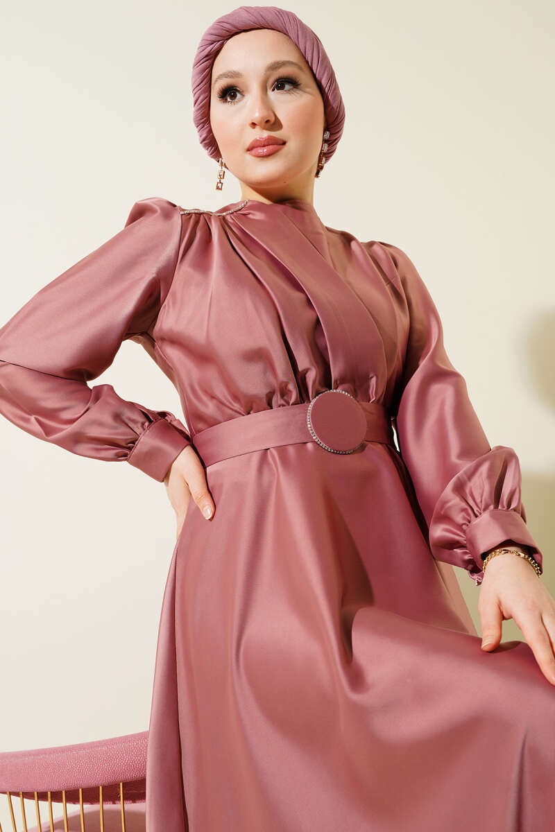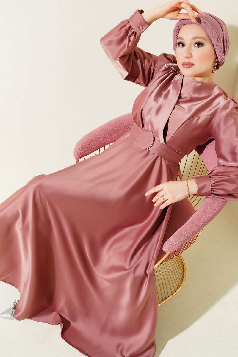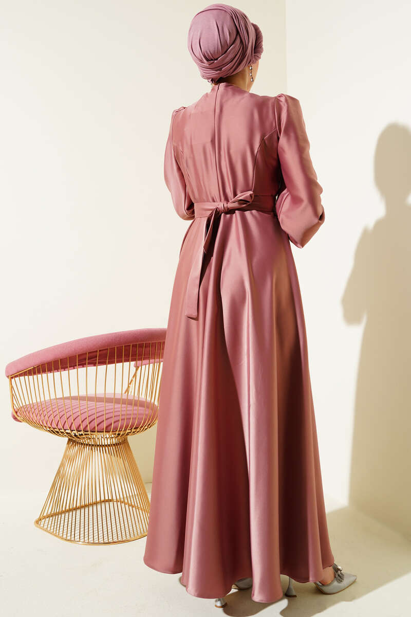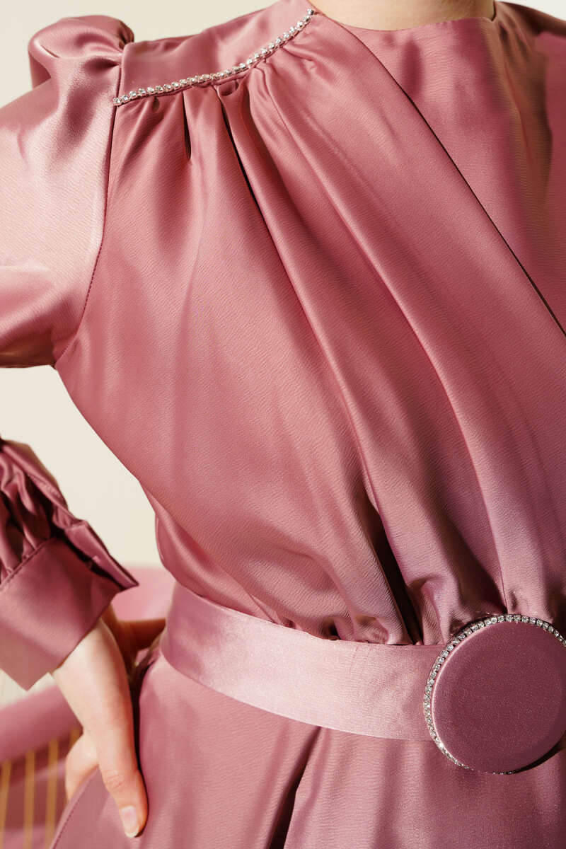 Pile Yakalı Taş Detaylı Saten Abiye Elbise Gül Kurusu