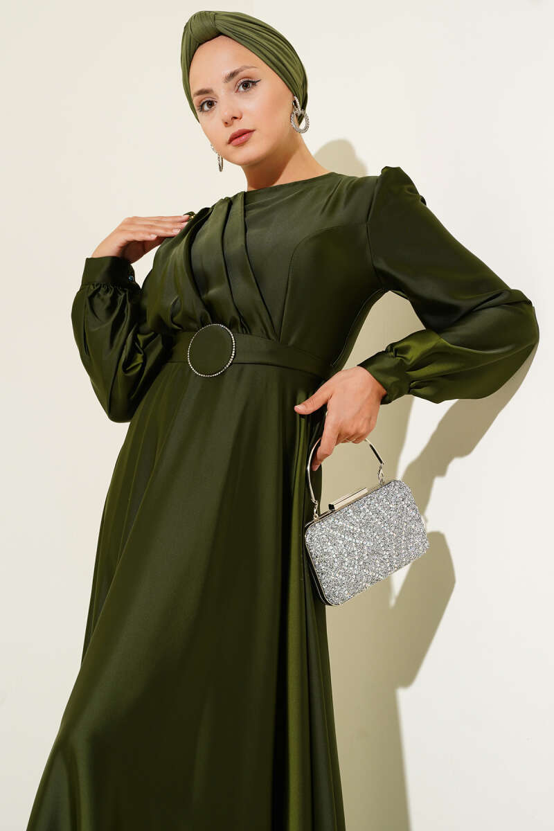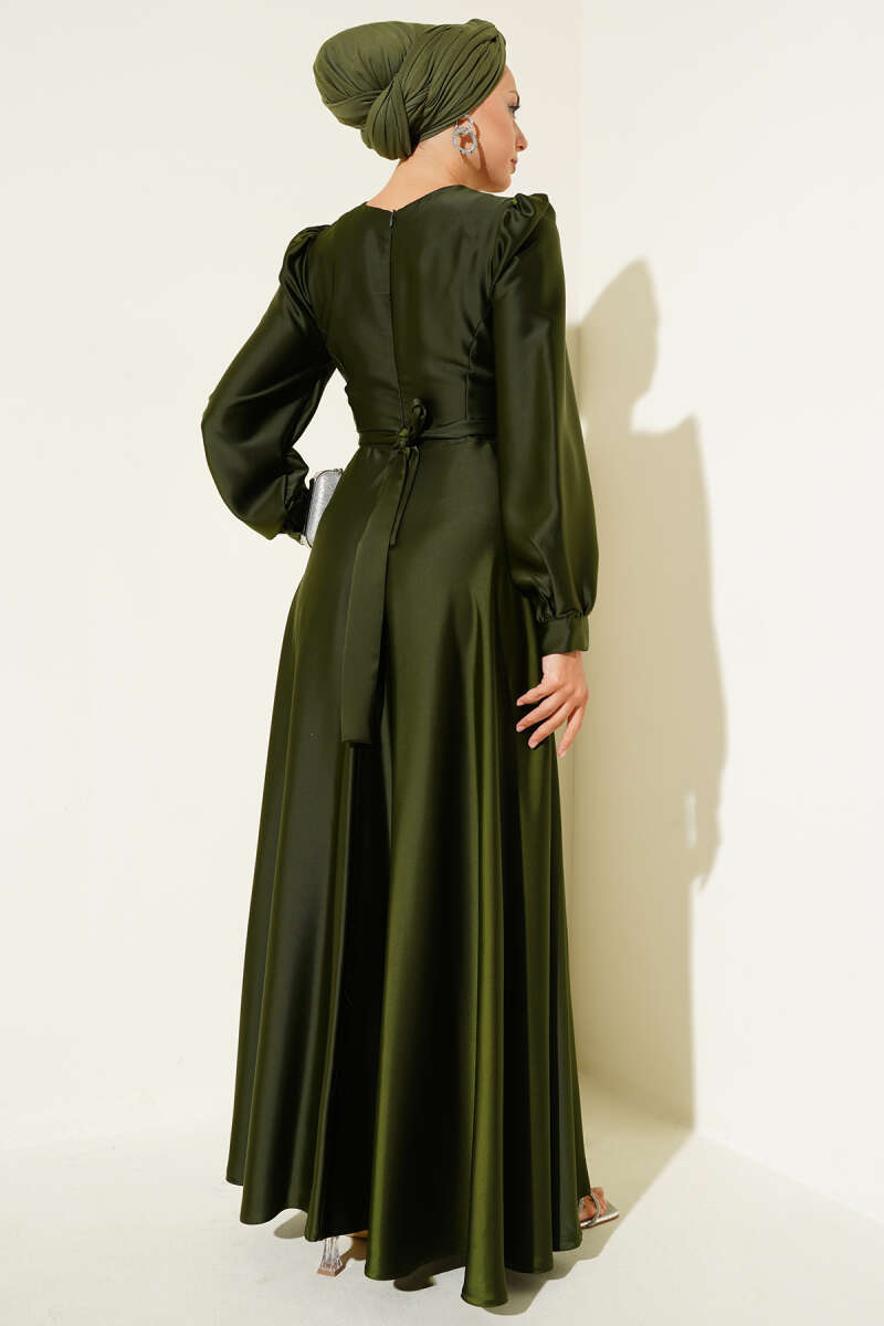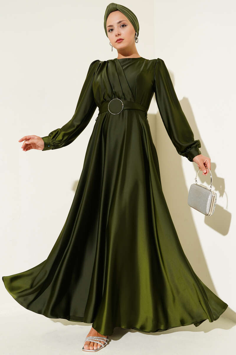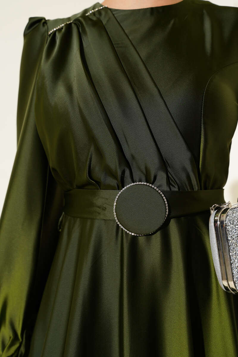 Pile Yakalı Taş Detaylı Saten Abiye Elbise Haki
