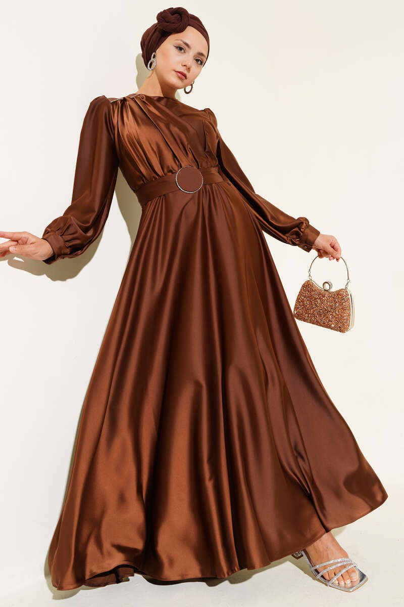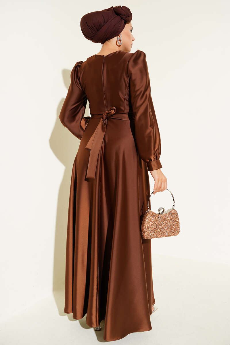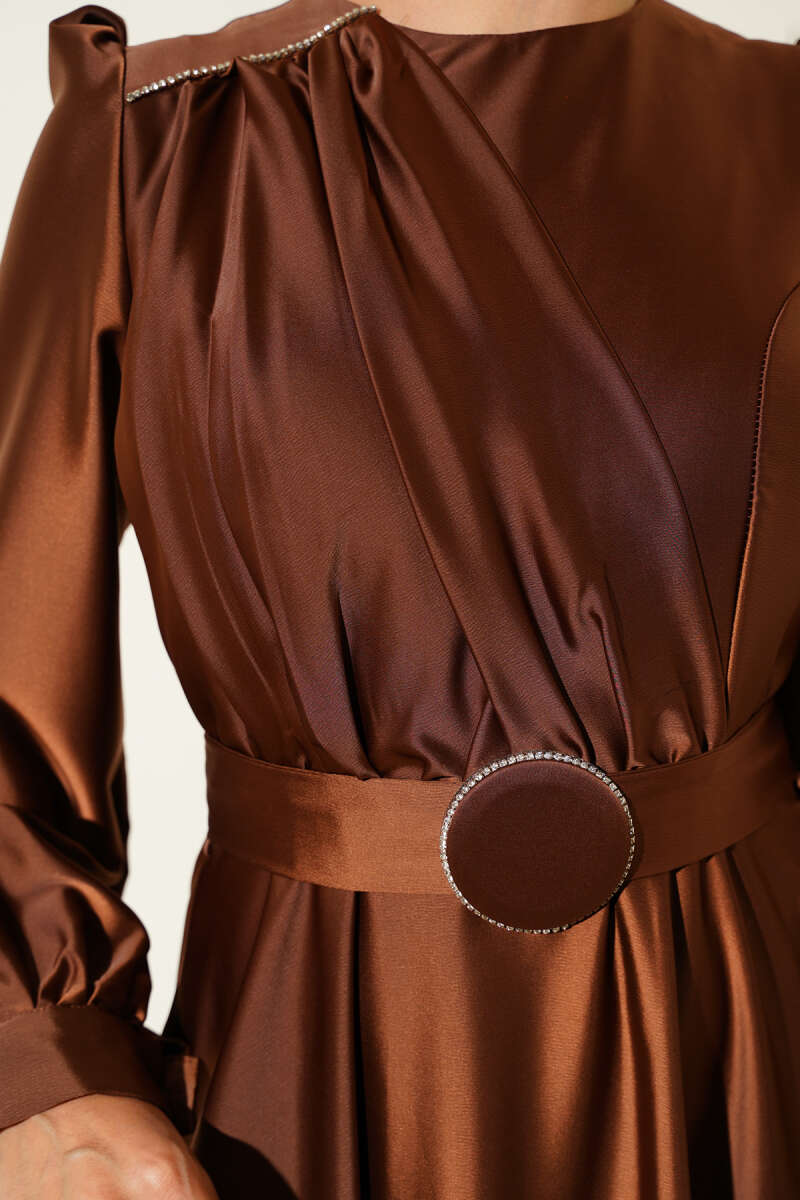 Pile Yakalı Taş Detaylı Saten Abiye Elbise Kahve