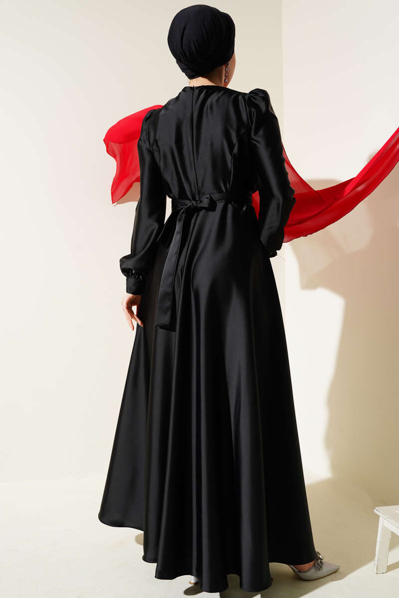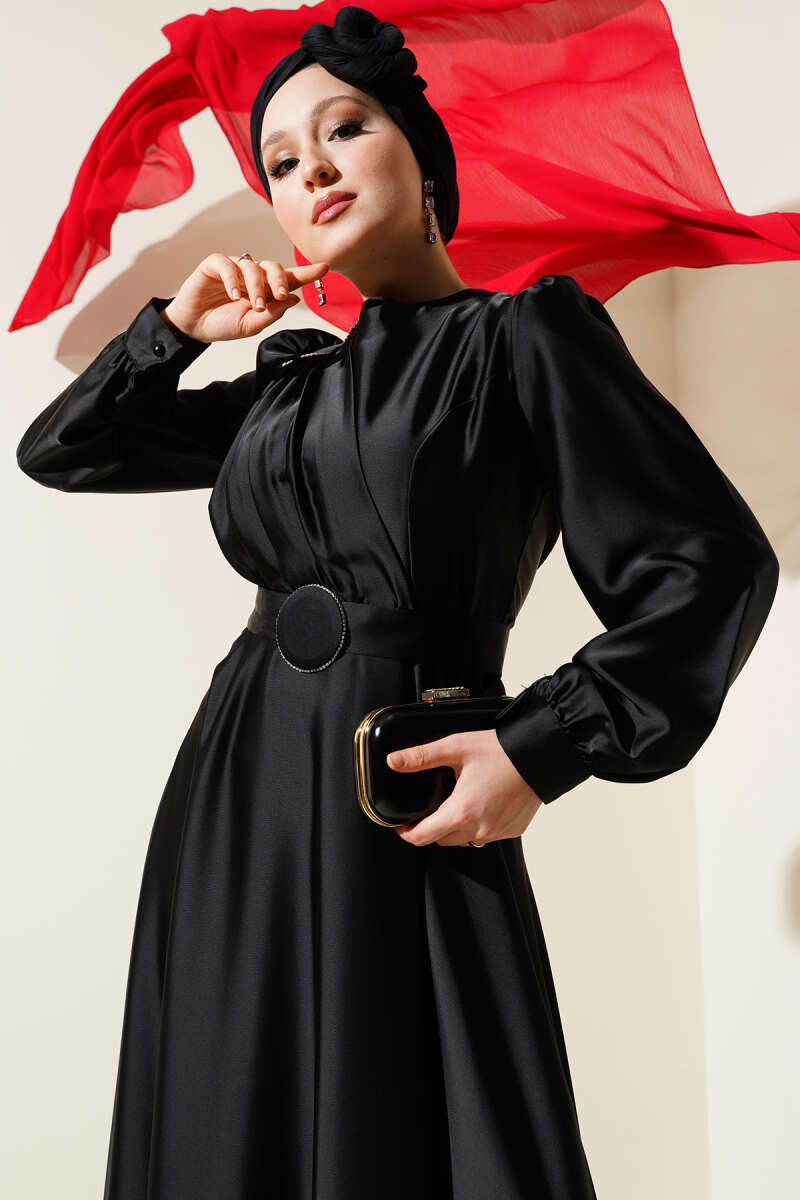 Kolları Fiyonk Detaylı Selanik Elbise Siyah