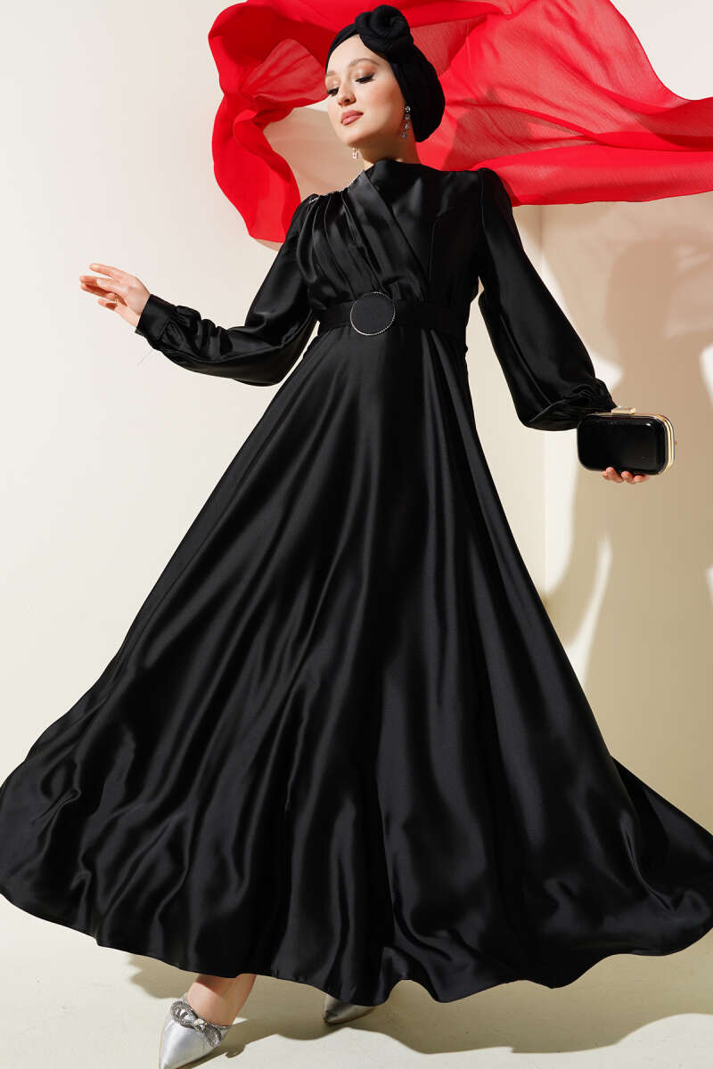 Önü Büzgülü Pul Payet Abiye Elbise Siyah