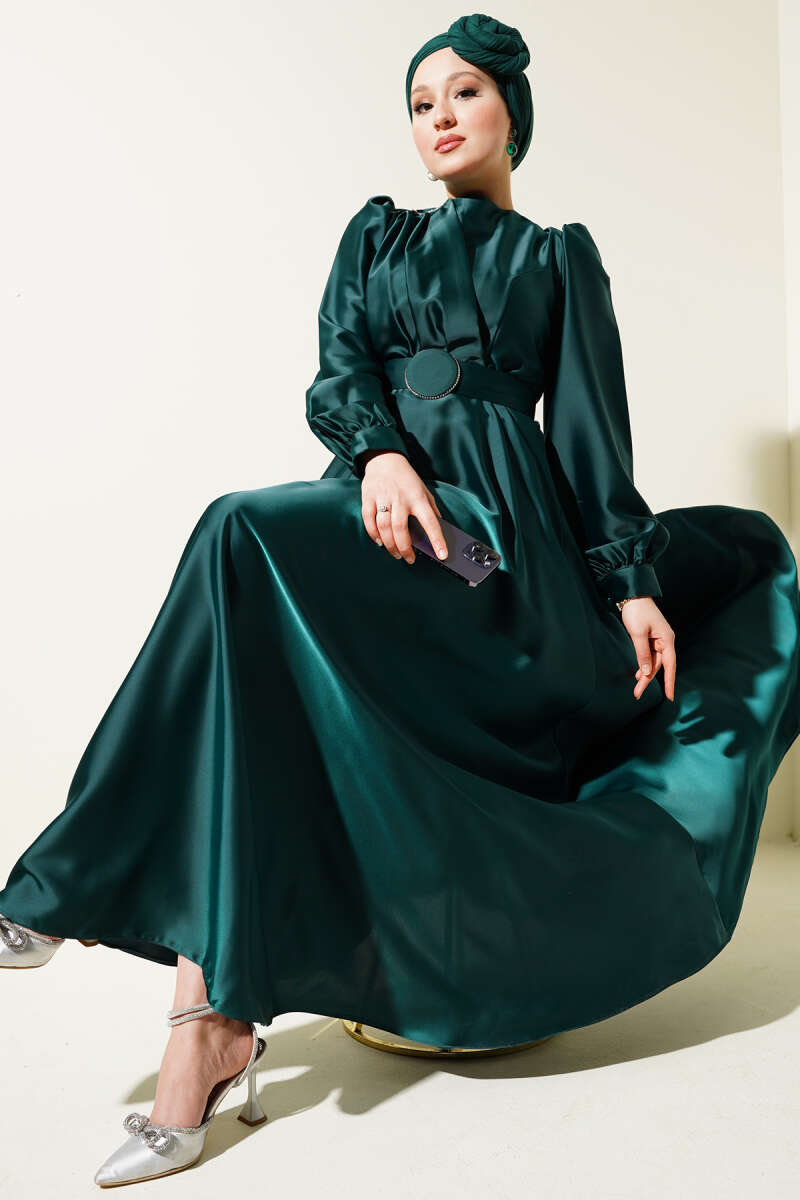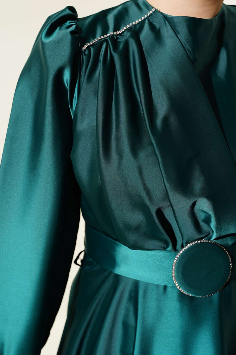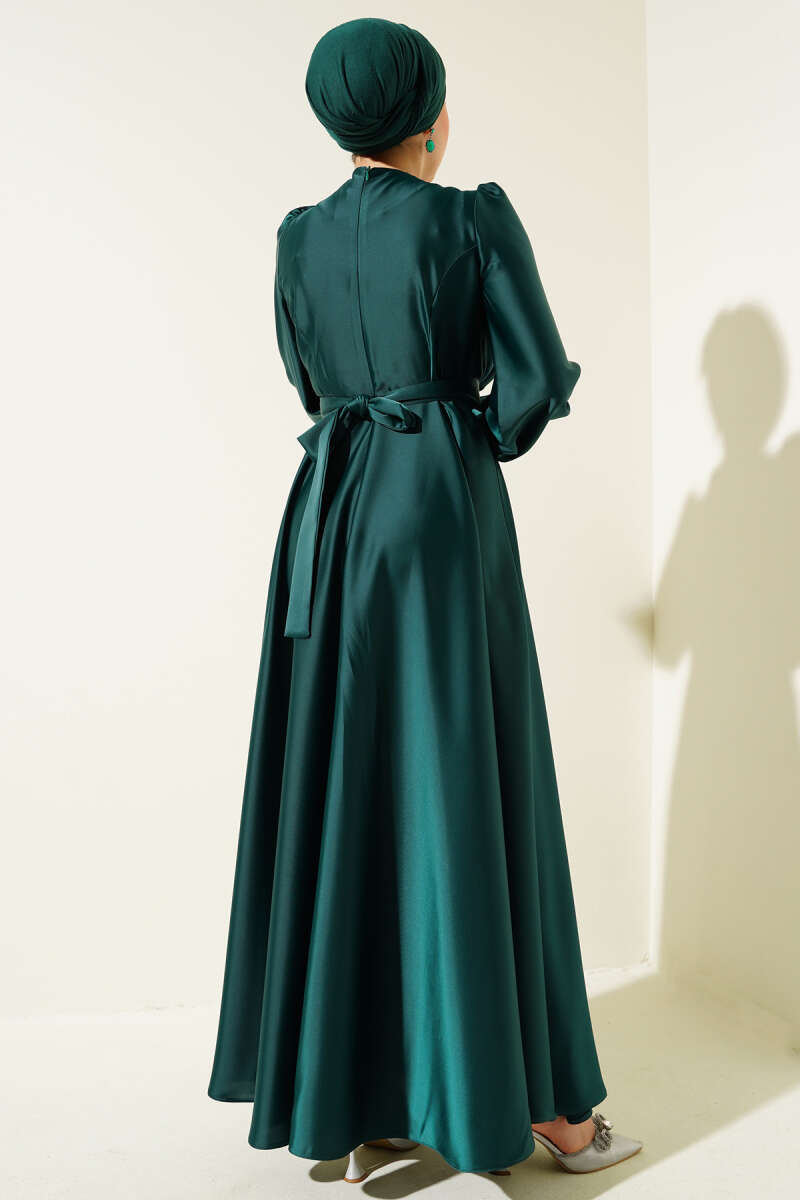 Pile Yakalı Taş Detaylı Saten Abiye Elbise Zümrüt