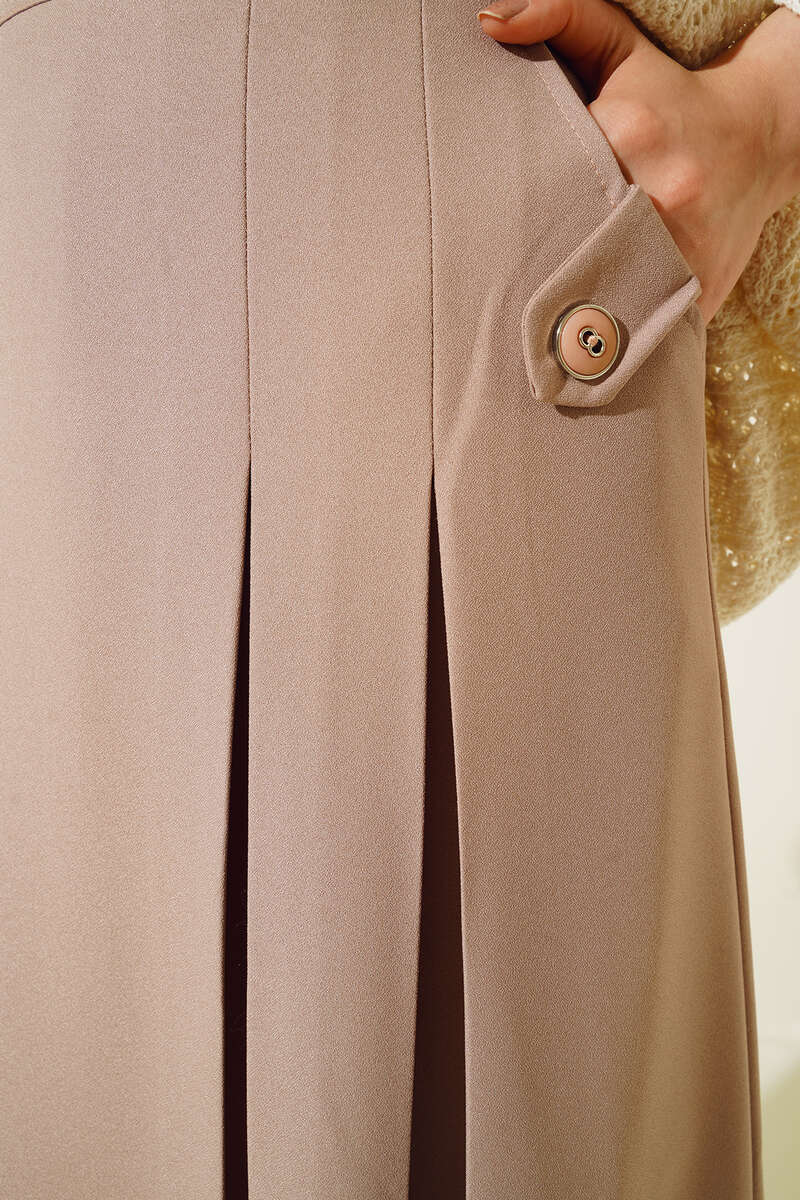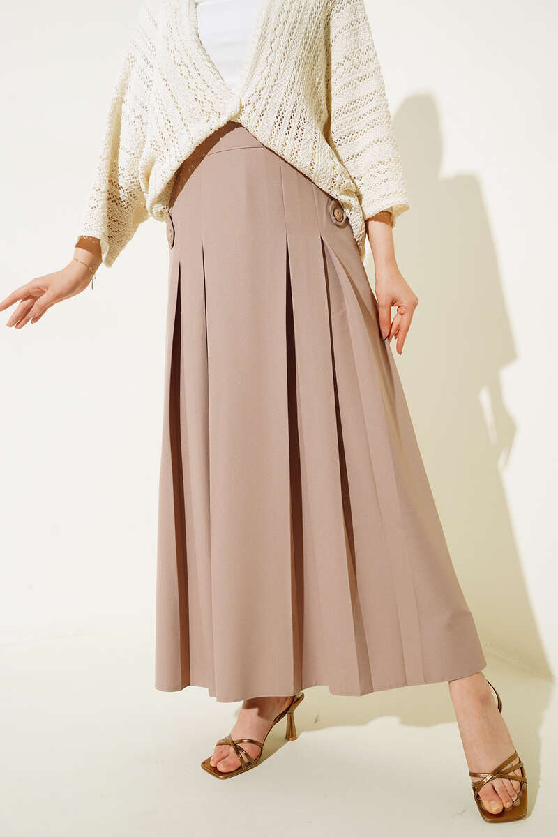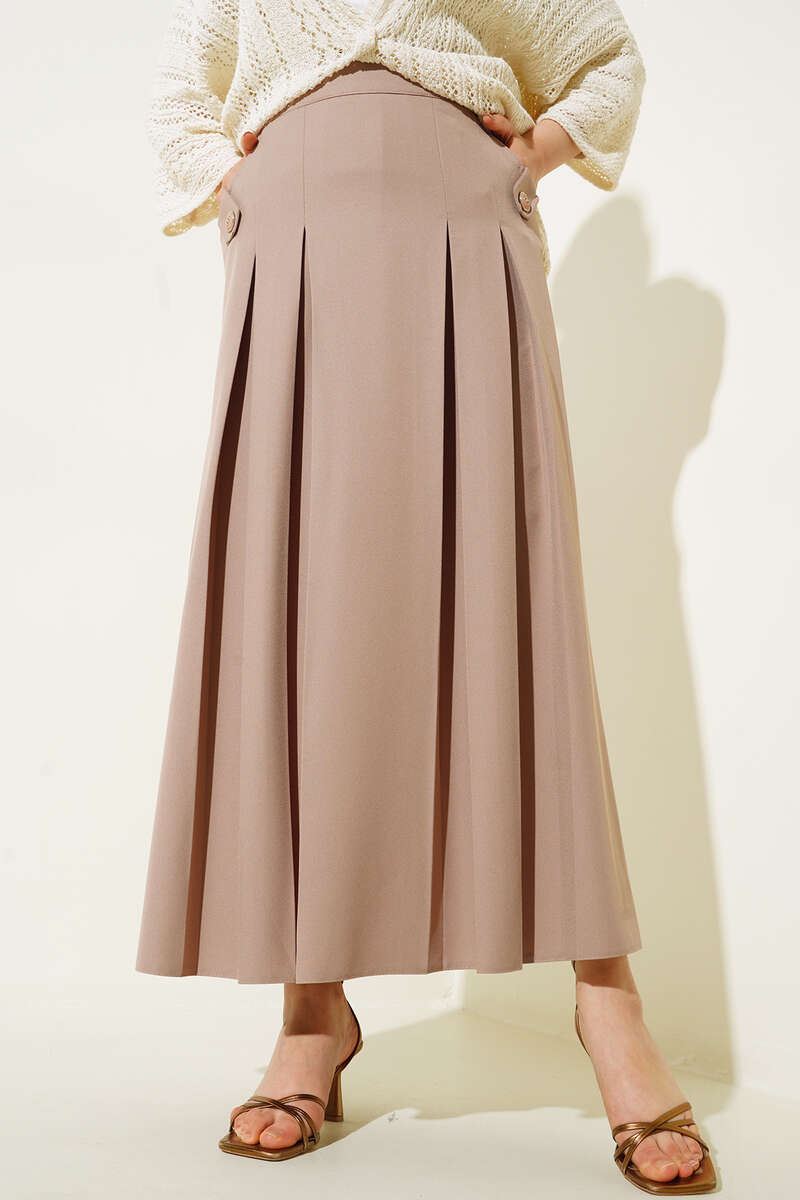 Yeni sezon pileli eteğimiz fermuarlıdır. Eteğimizin iki adet düğme detaylı cebi bulunmaktadır. Renk seçenekleri mevcuttur.