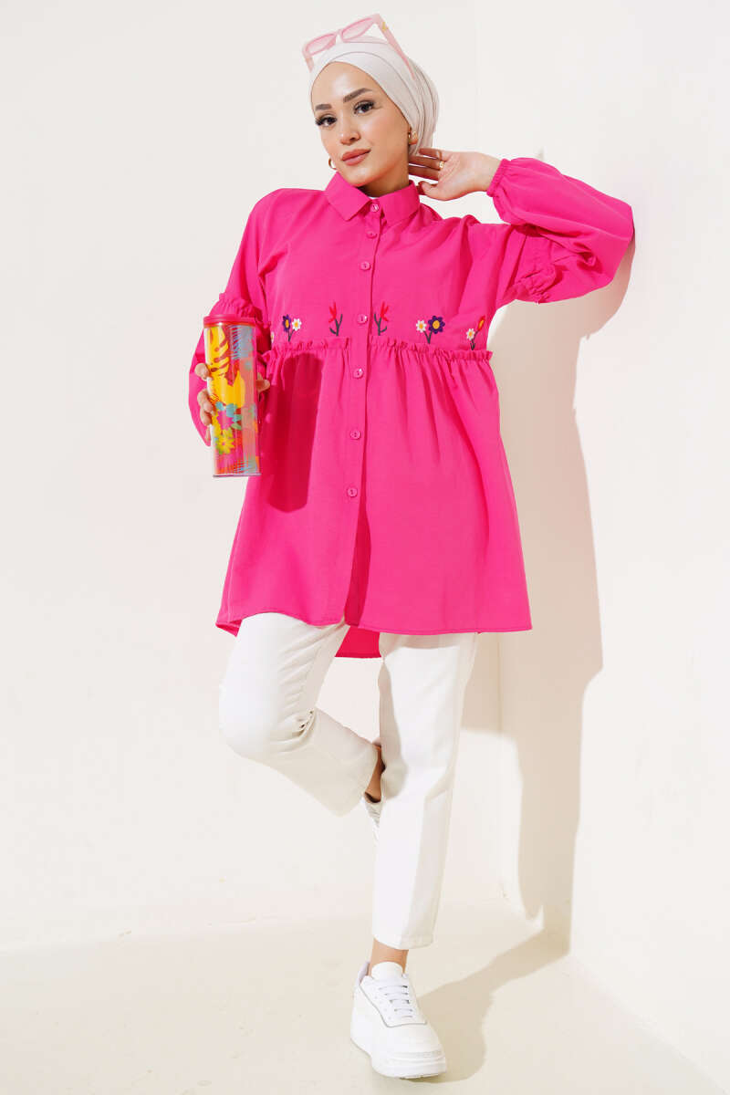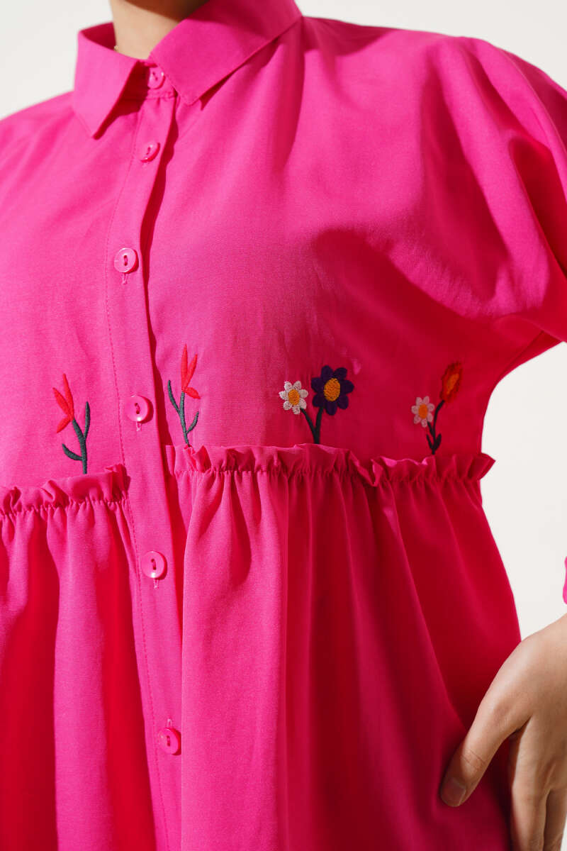Pileli Çiçek Nakışlı Gömlek Fuşya