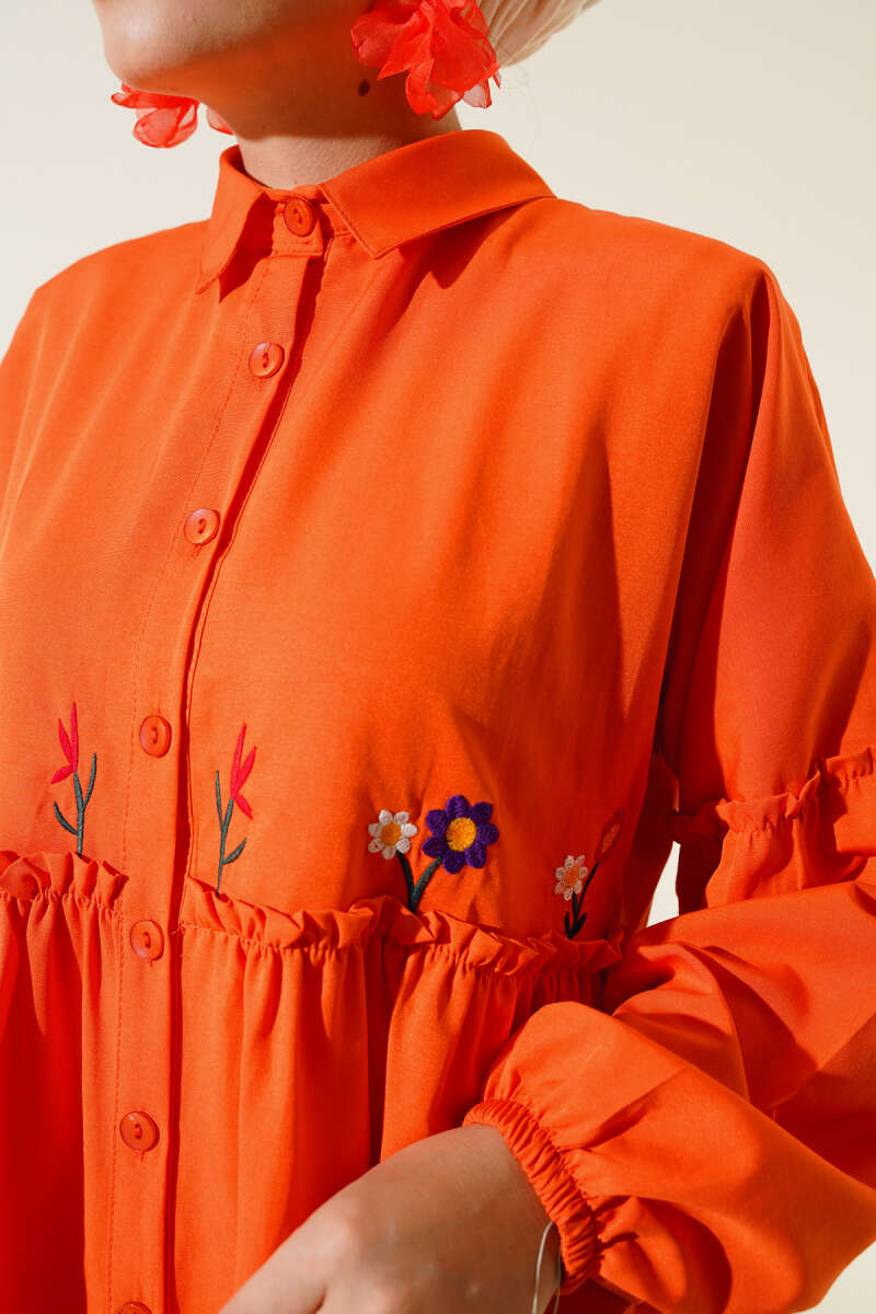 Pileli Çiçek Nakışlı Gömlek Oranj
