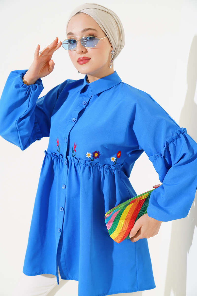 Mini Çiçekli Göğüs Cepli Kot Gömlek Açık Mavi