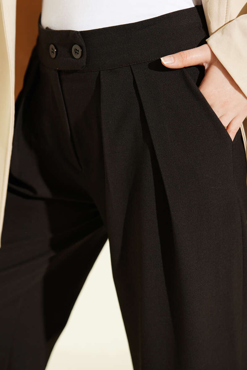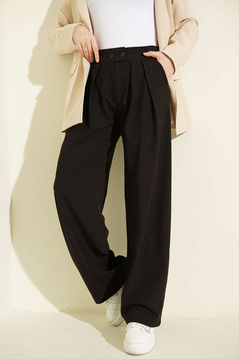 Geniş Paça Düğmeli Pantolon Siyah
