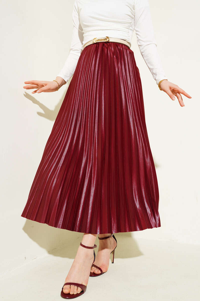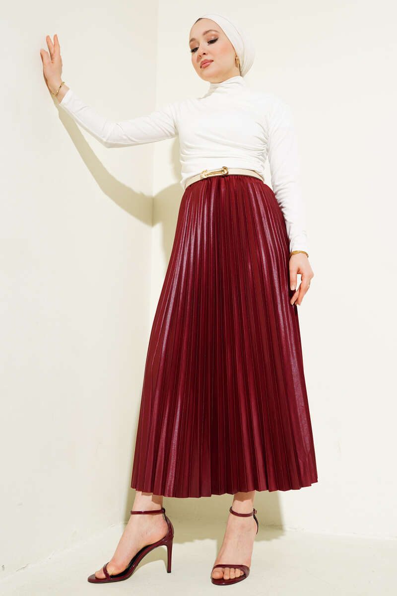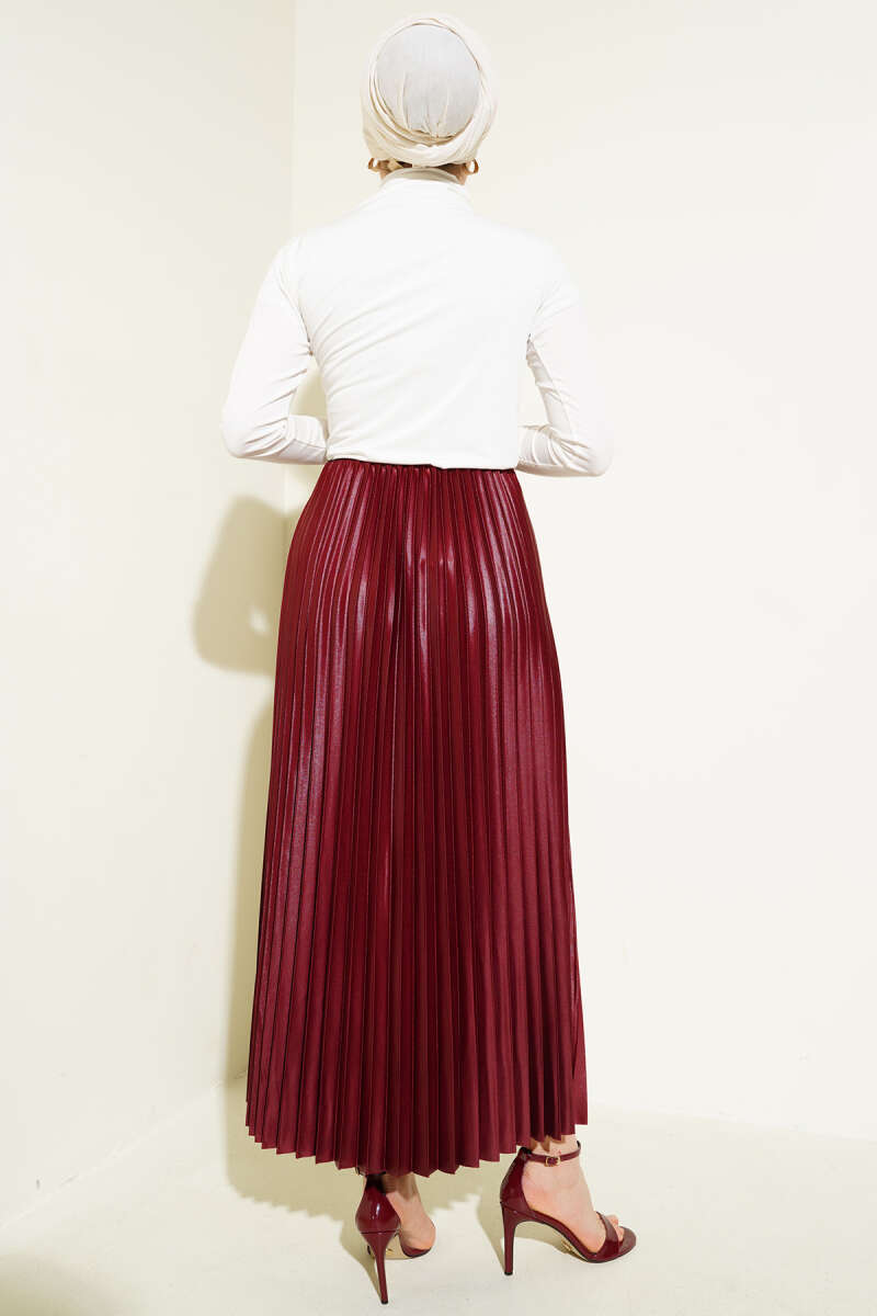 Pileli Deri Görünümlü Bel Lastikli Etek Bordo