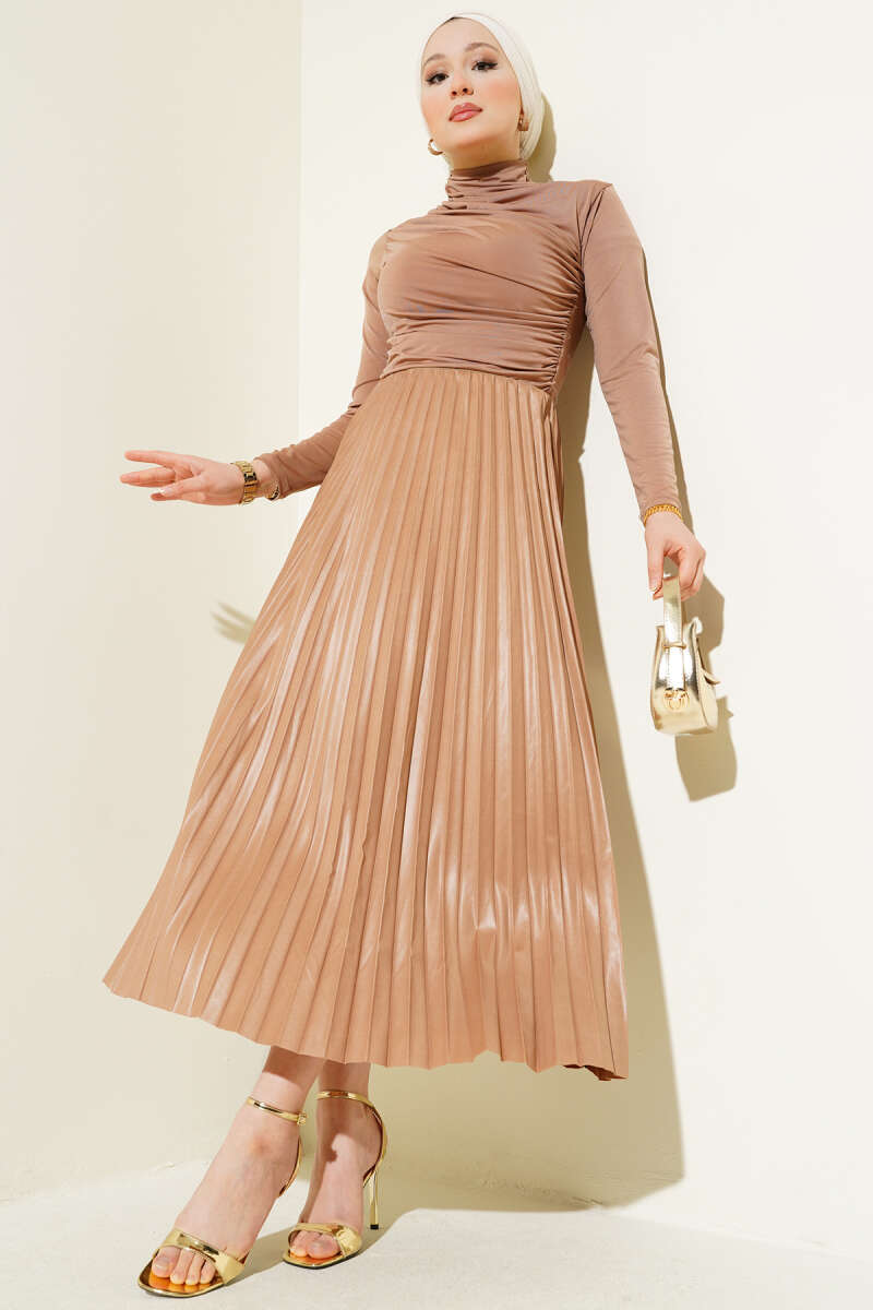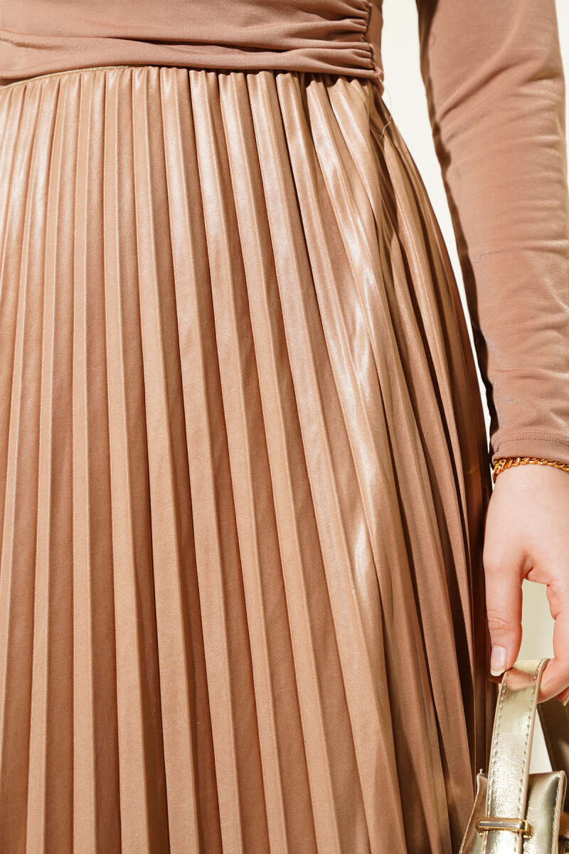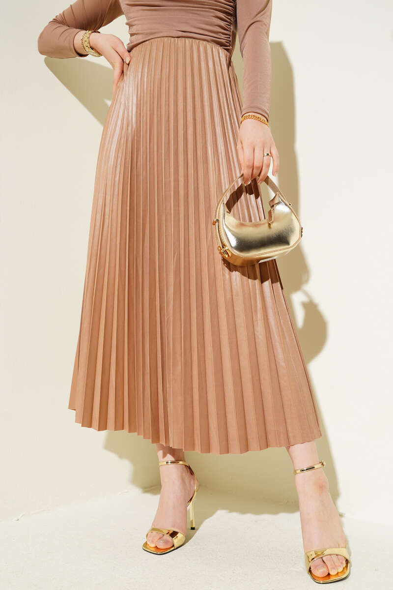 Beli Kemerli Lastikli Pileli Etek Vizon