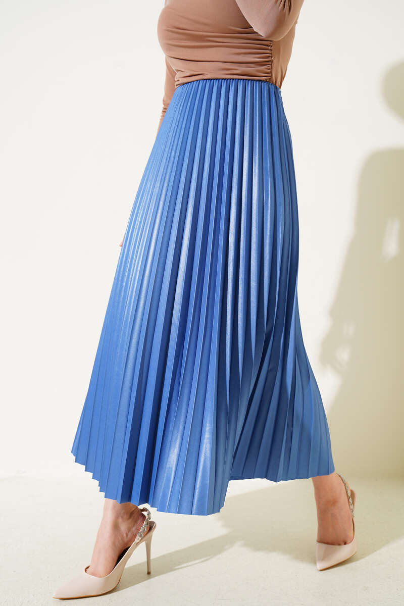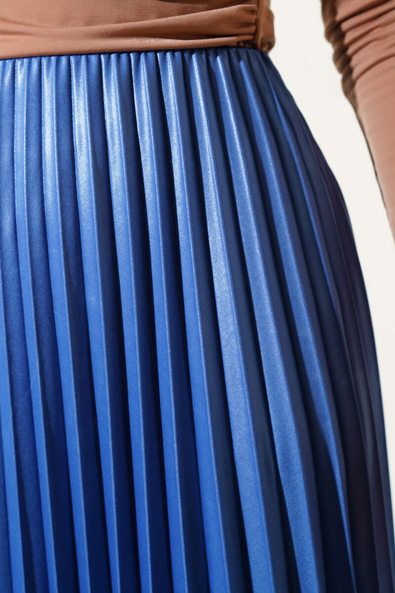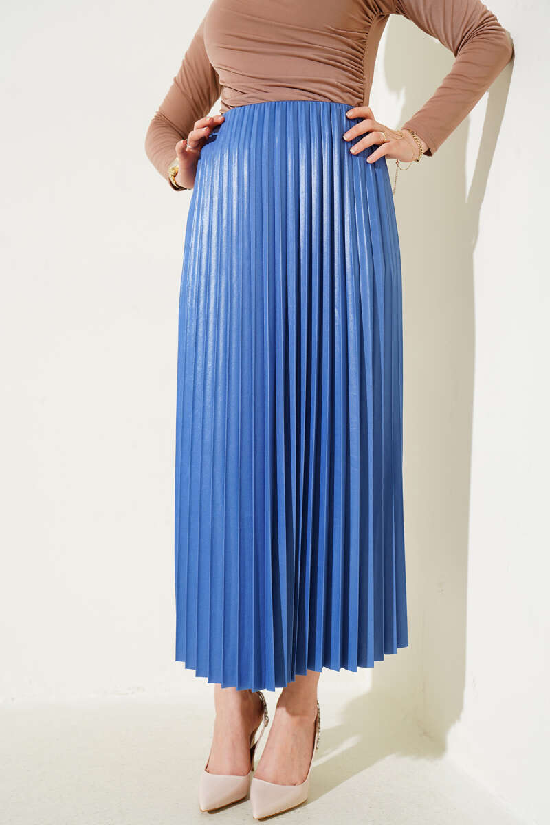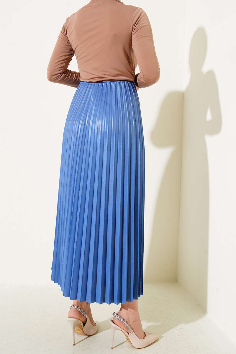 Beli Kemerli Lastikli Pileli Etek Lacivert