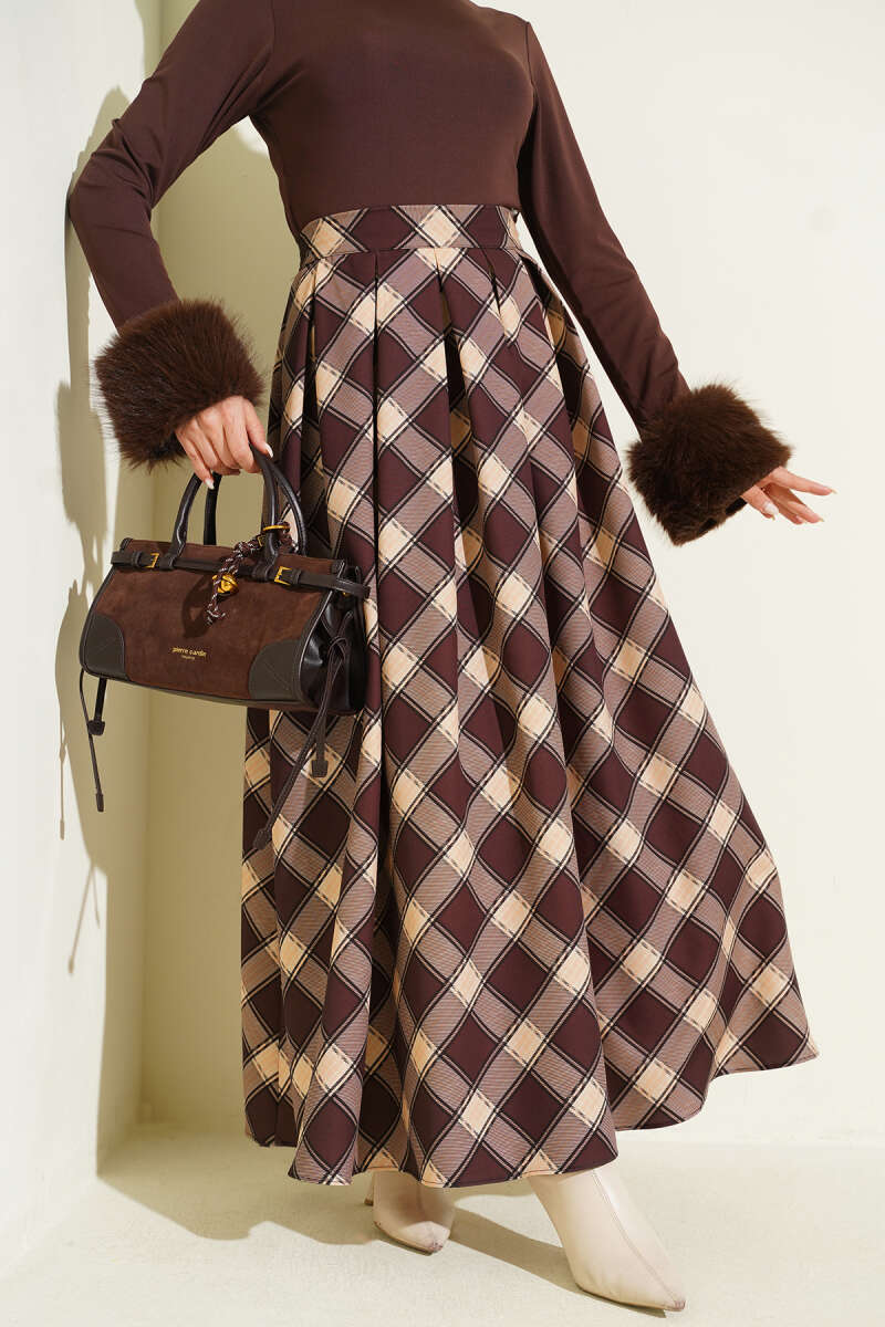 Pileli Ekoseli Fermuarlı Etek Mürdüm