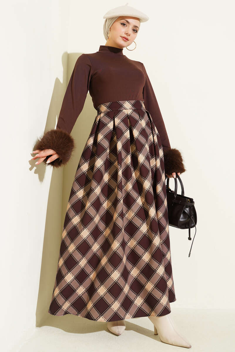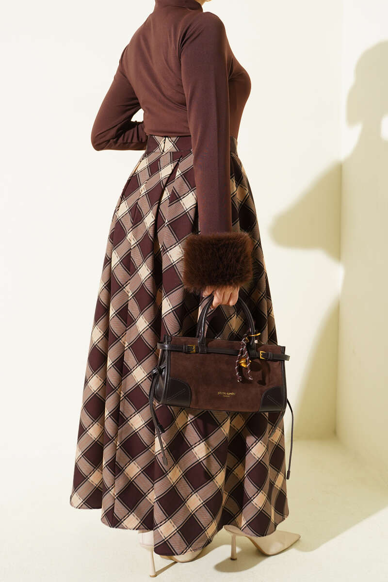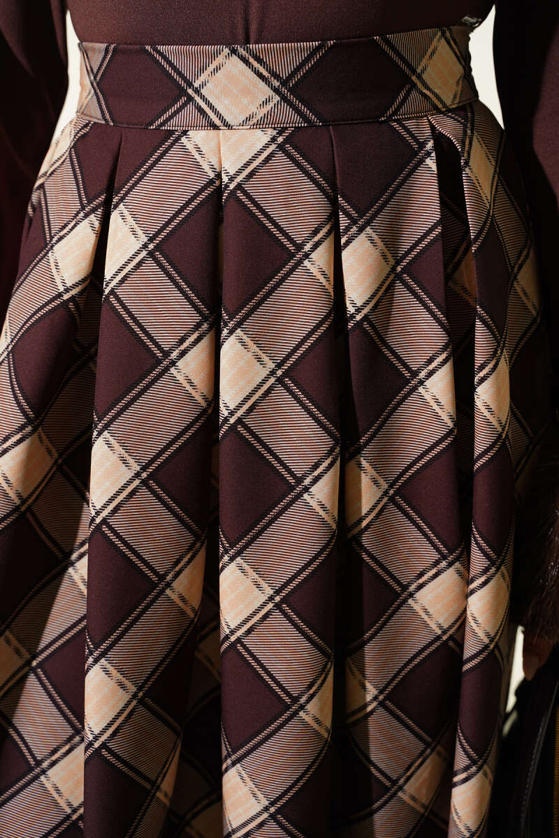 Pileli Ekoseli Fermuarlı Etek Latte