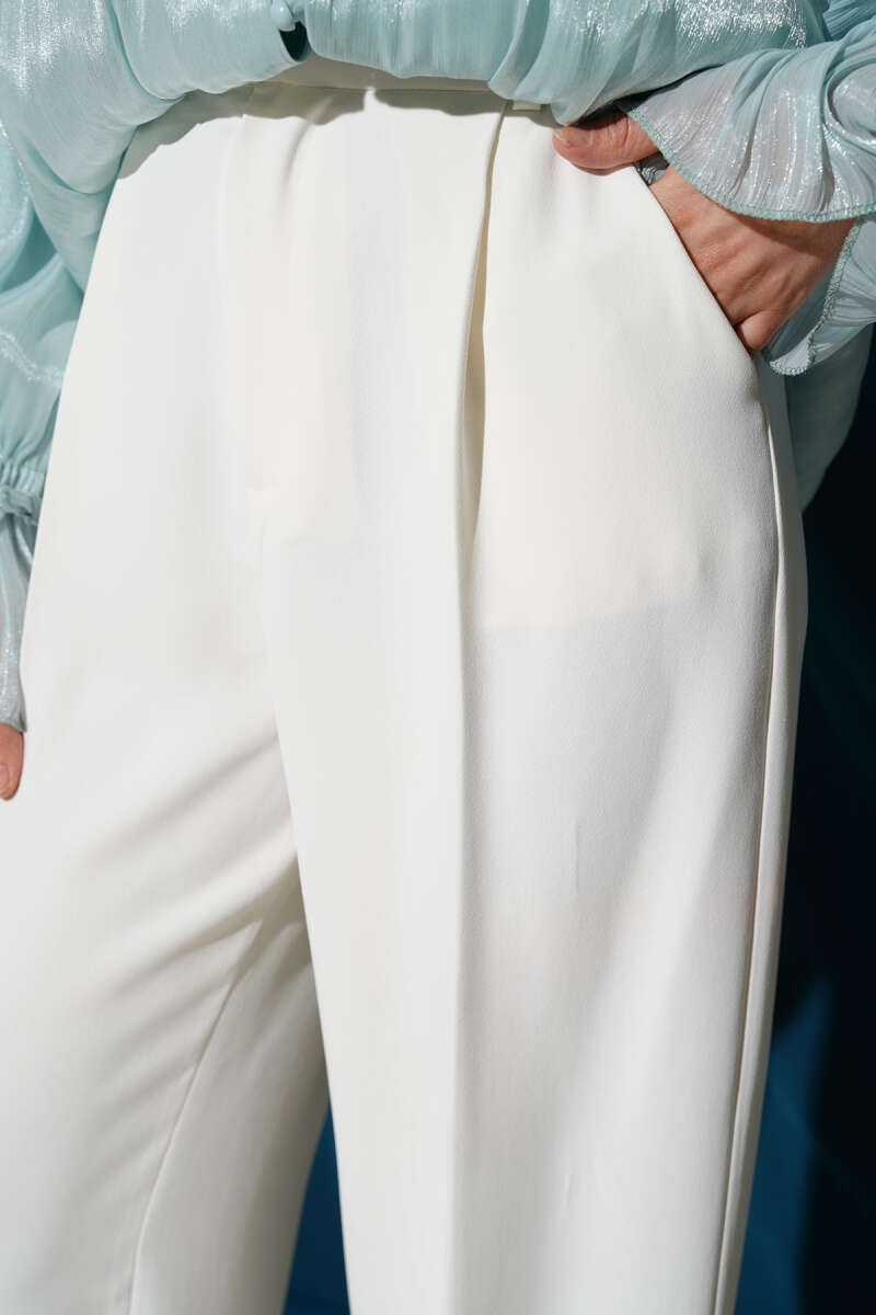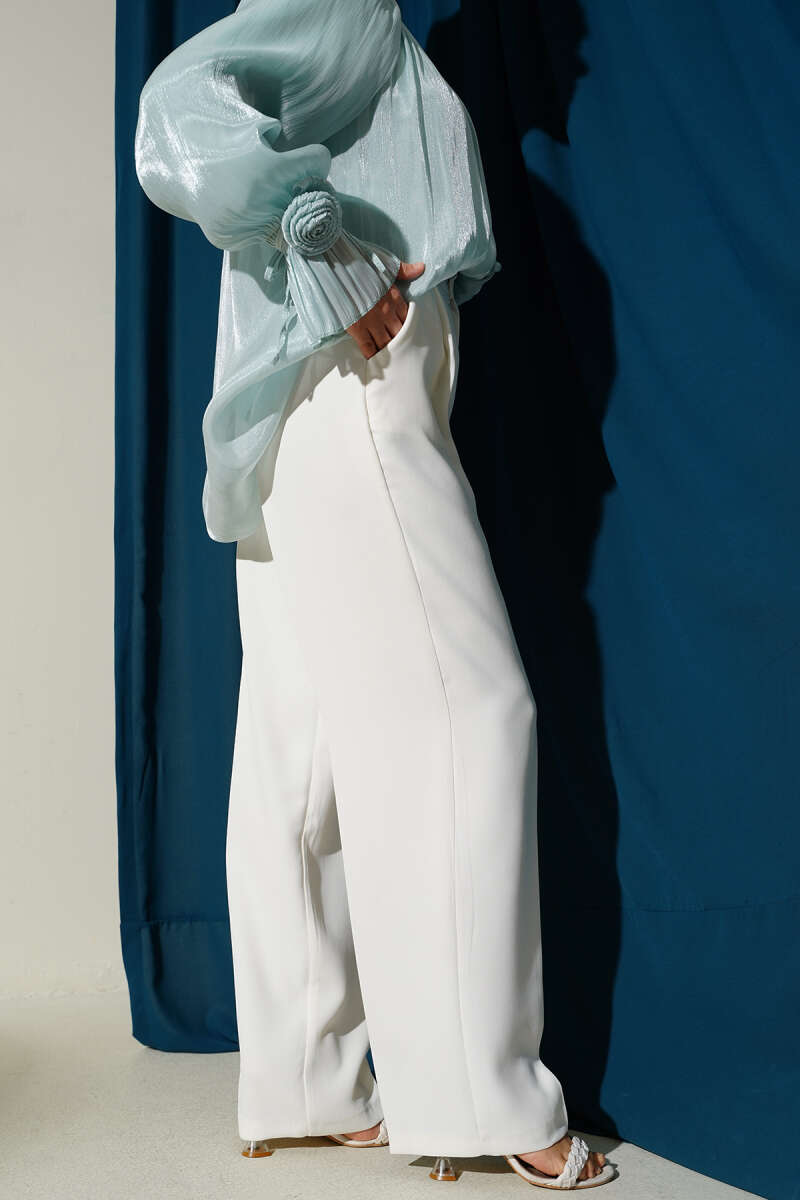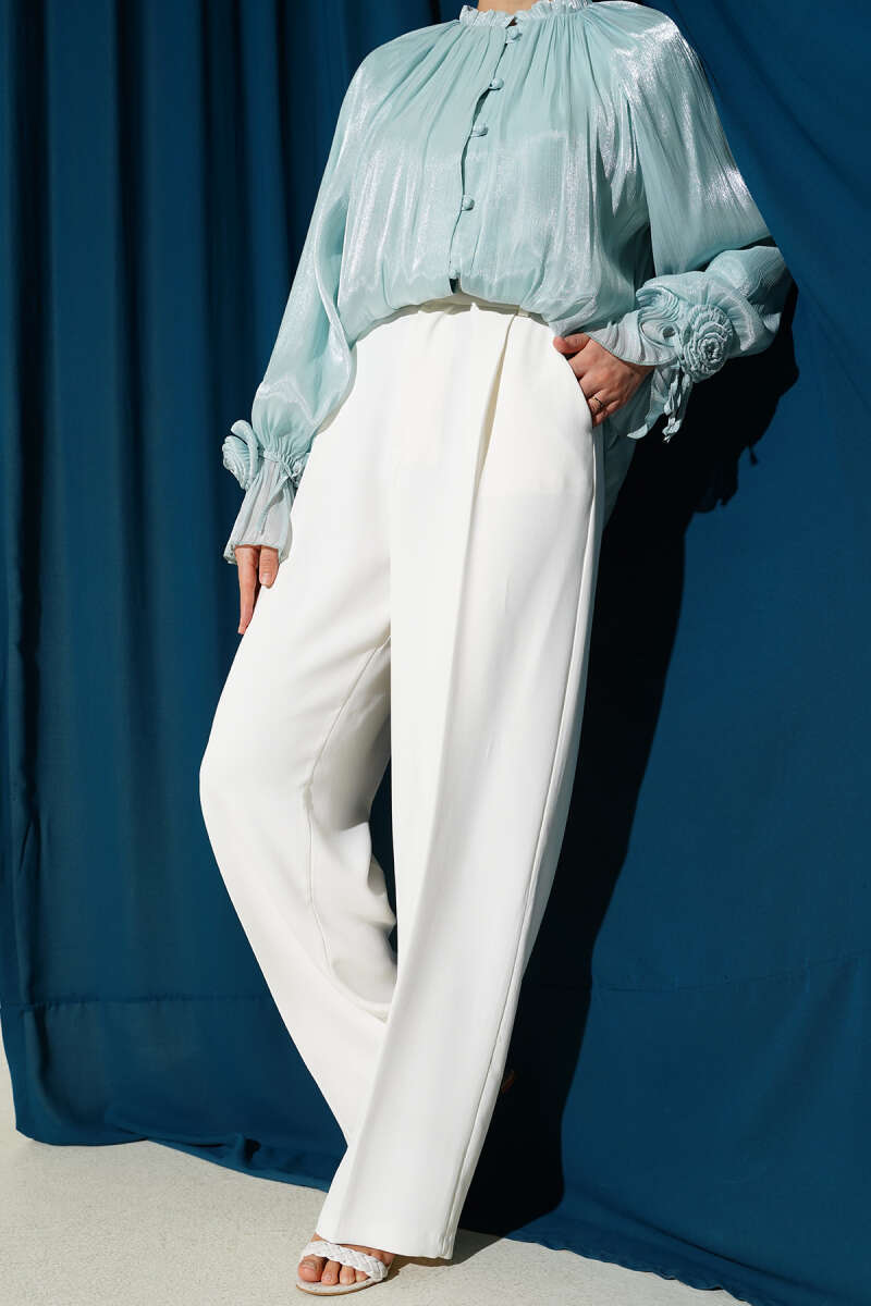 Pileli Geniş Paça Kumaş Pantolon Beyaz