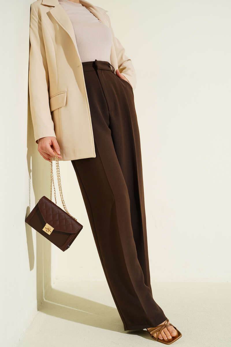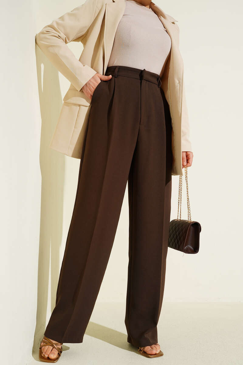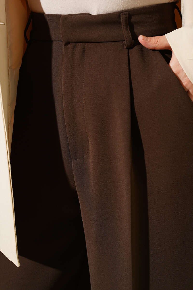 Pileli Geniş Paça Kumaş Pantolon Kahve