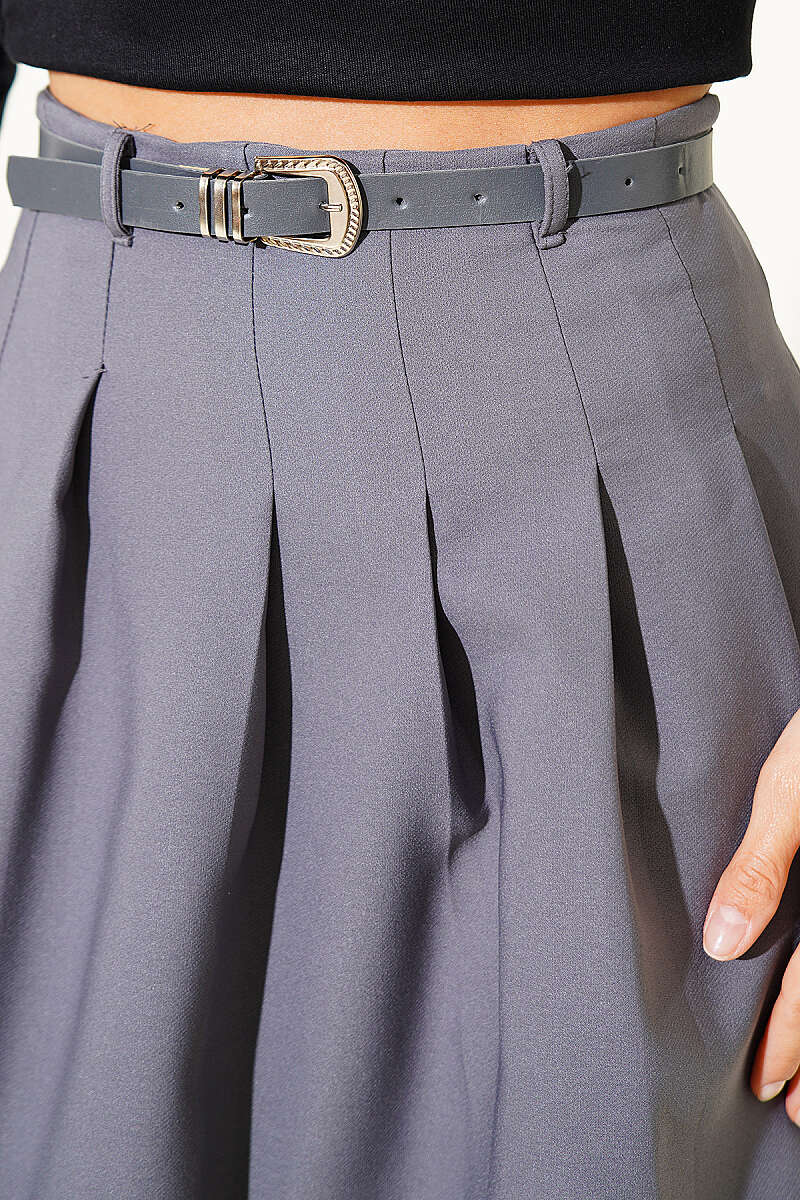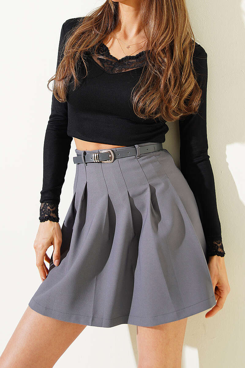 Pileli Kemerli Mini Etek Füme