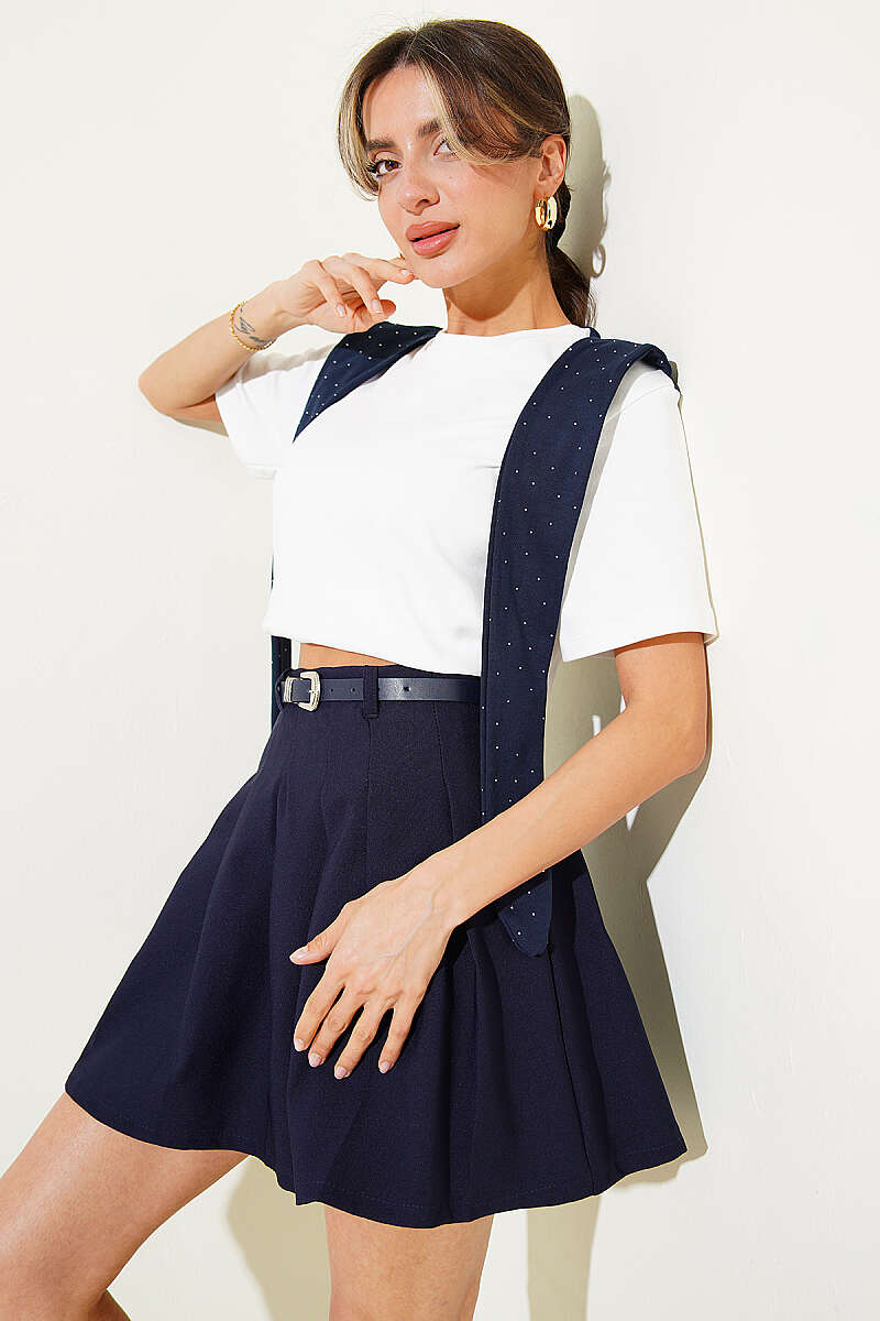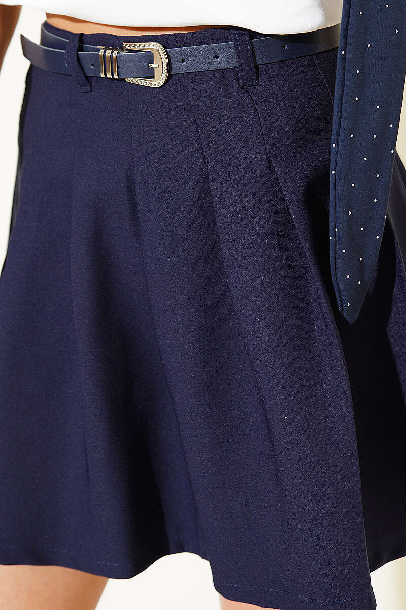 Pileli Kemerli Mini Etek Lacivert