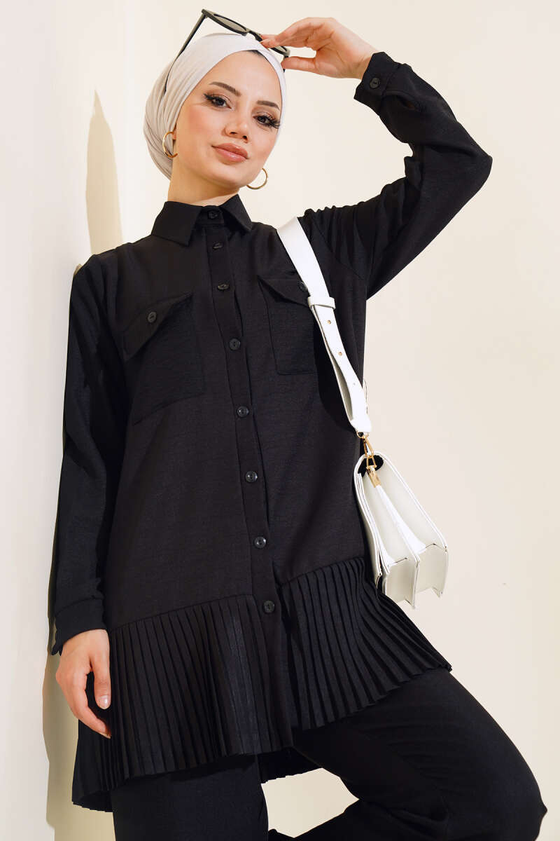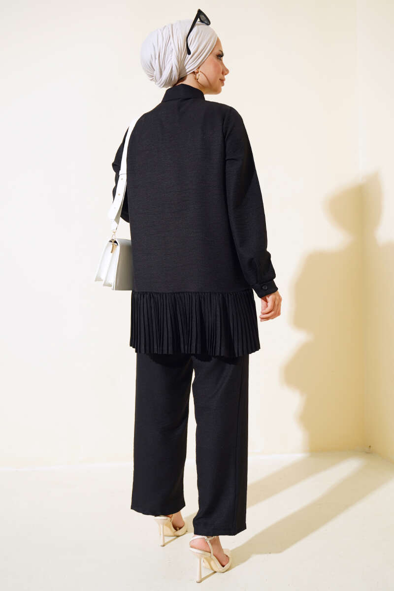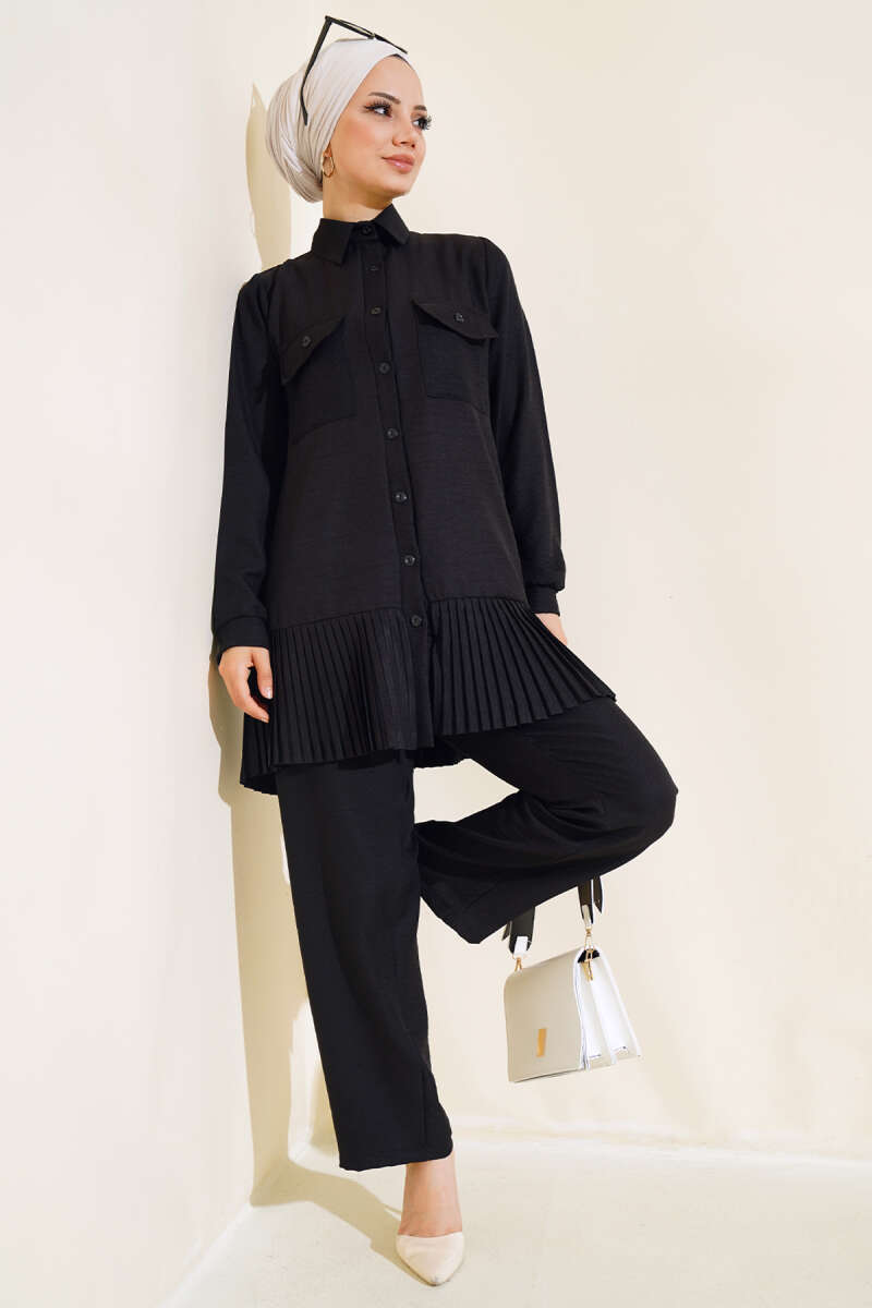Yeni sezon ikili takım modelimiz sizlerle beraber. Tuniğimizin etek ucu pilelidir. Önü boydan düğmelidir. Göğsünde iki adet kapaklı cebi vardır. Kol bilekleri manşetli ve düğmelidir. Pantolonumuzun beli lastiklidir. Cepsizdir. Geniş paçalıdır. İkili takımımız hem şık hem sportif tasarımıyla kombin yapmak daha kolay. Renk seçeneklerimiz mevcuttur.